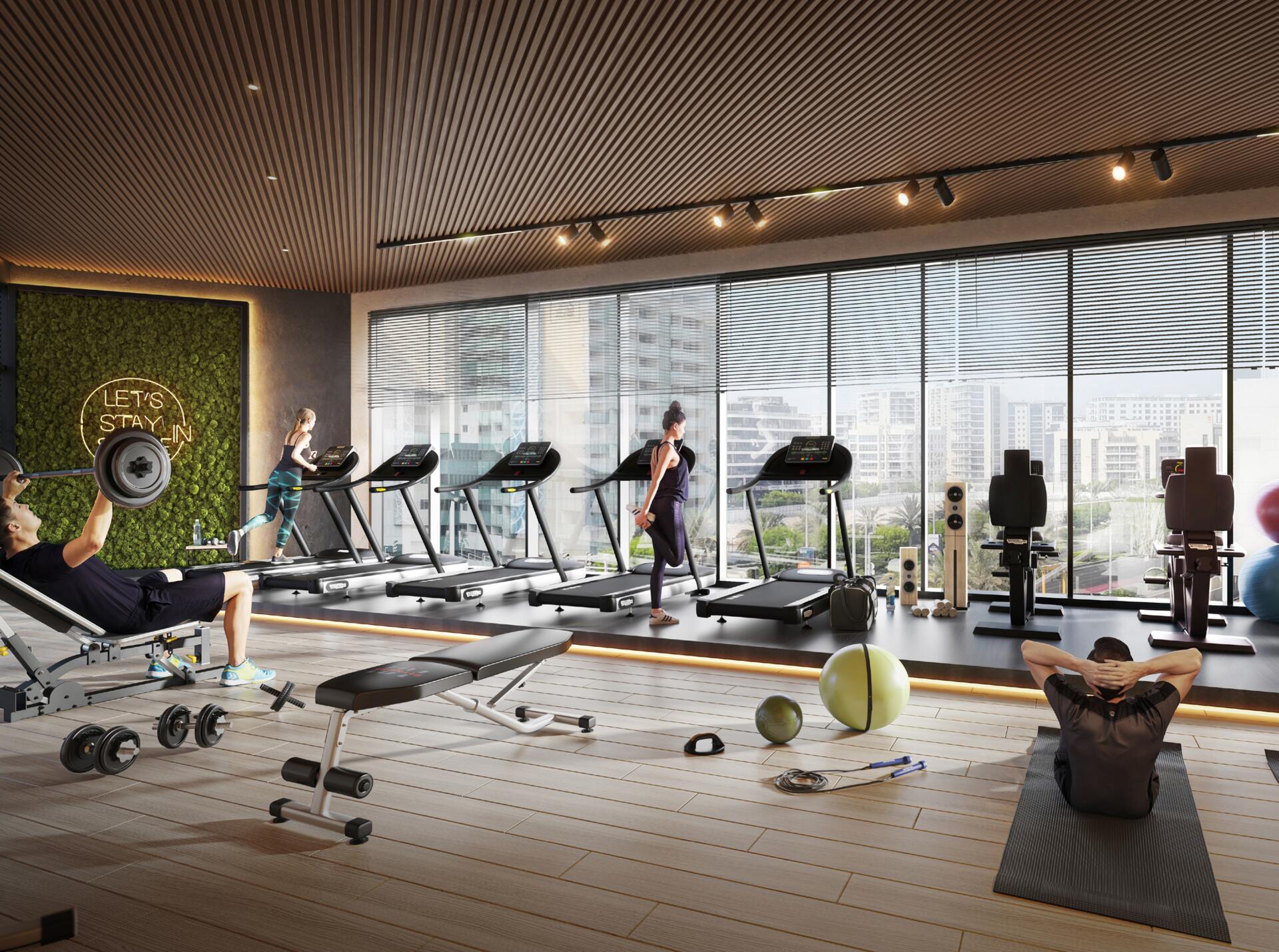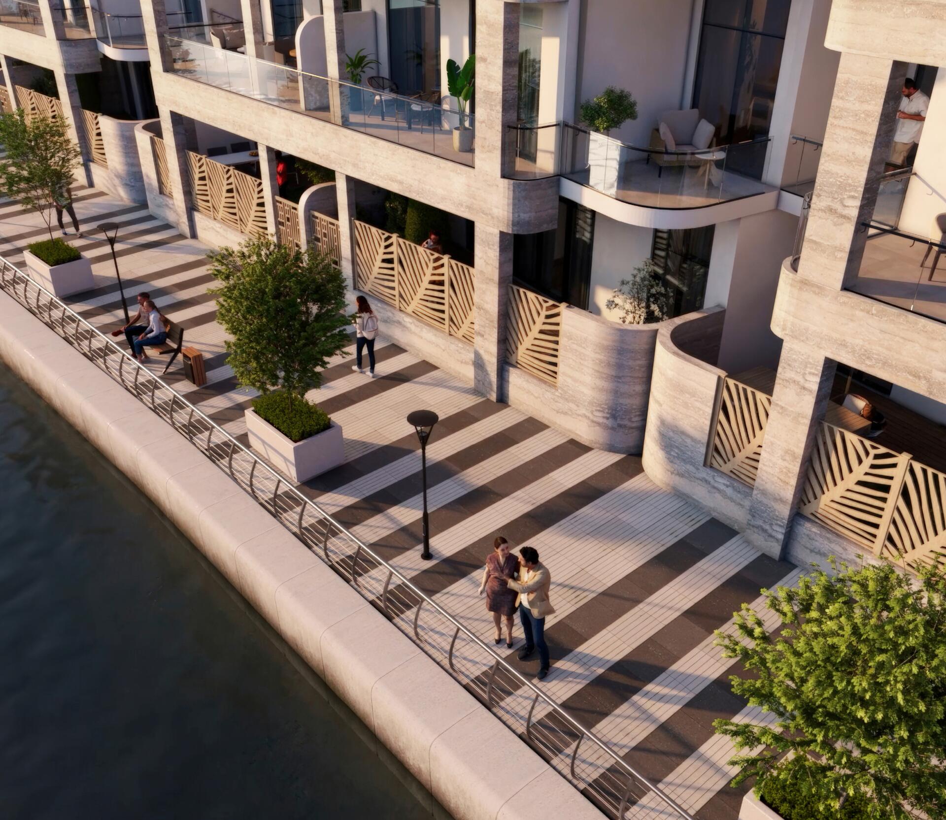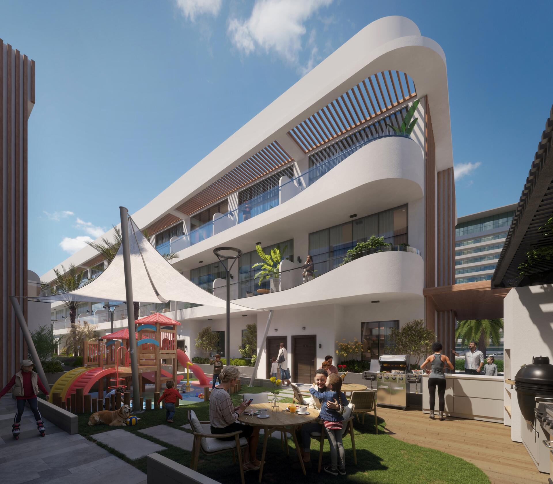 The exterior of the complex is defined by smooth architectural lines and a neutral color palette that blends harmoniously into the Al Raha Creek development. The amenities include adult and children’s swimming pools, a gym, relaxation areas, children’s play spaces, landscaped areas, barbecue zones, and underground parking.