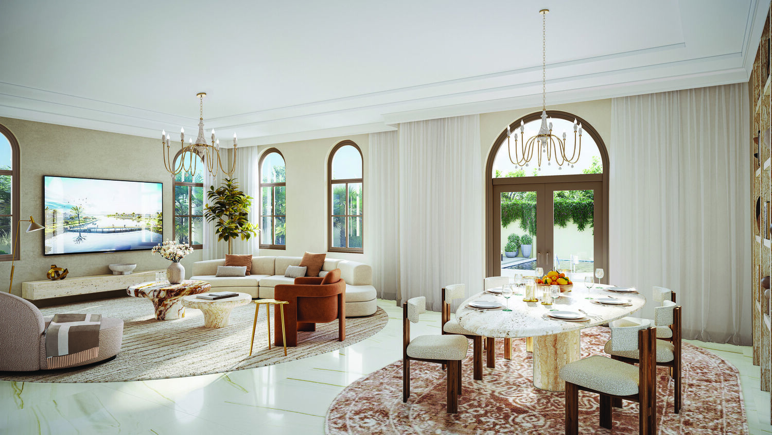 The luxury villas at Almeria offer two interior finish options: the default Premium finish, featuring designer porcelain tiles, bespoke mosaics, and sustainable materials, and the Upgrade finish, which gives you the opportunity to choose the finish yourself, and which adds sophisticated touches like polished marble, hardwood flooring, and brass hardware for a more refined, personalized ambiance.