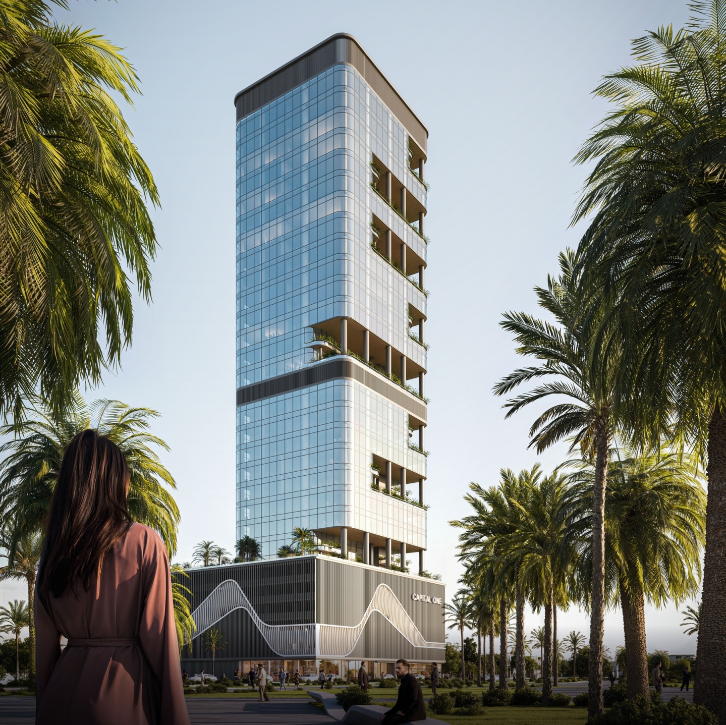 Capital One JVC is an ultra-modern office building presented in the Dubai real estate market by OCTA Properties. The project was developed by Centurion Developers, a recognized leader in transforming urban landscapes using innovative technologies. The company offers premium-class offices in the heart of the metropolis — in the JVC area. The futuristic architectural design of the building stands out with an elegant glass facade with open landscaped terraces that create a dynamic and striking appearance. The building has three levels of basement parking, a spacious ground floor, five podium levels, twenty-three floors dedicated to offices, a warehouse floor, and a roof.