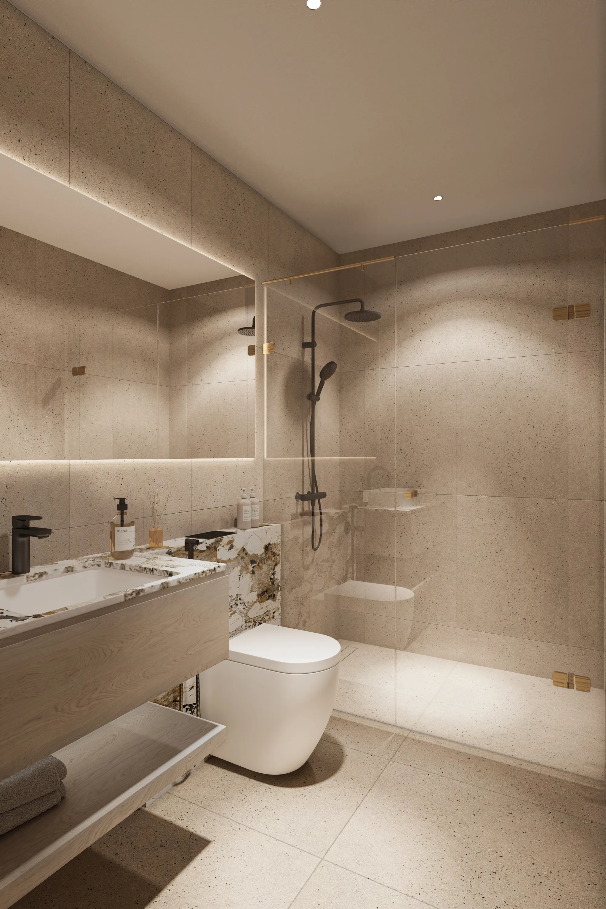 Interiors are designed with timeless elegance and a focus on light, proportion, and comfort. Living areas feel warm and welcoming, with carefully curated finishes that enhance natural brightness and spatial flow. Kitchens are modern and functional, seamlessly integrated into the living spaces with quality cabinetry and refined surfaces that balance practicality with aesthetic appeal. Bedrooms and bathrooms are styled to reflect serenity and understated luxury, ensuring each home feels like a private retreat within a vibrant community.