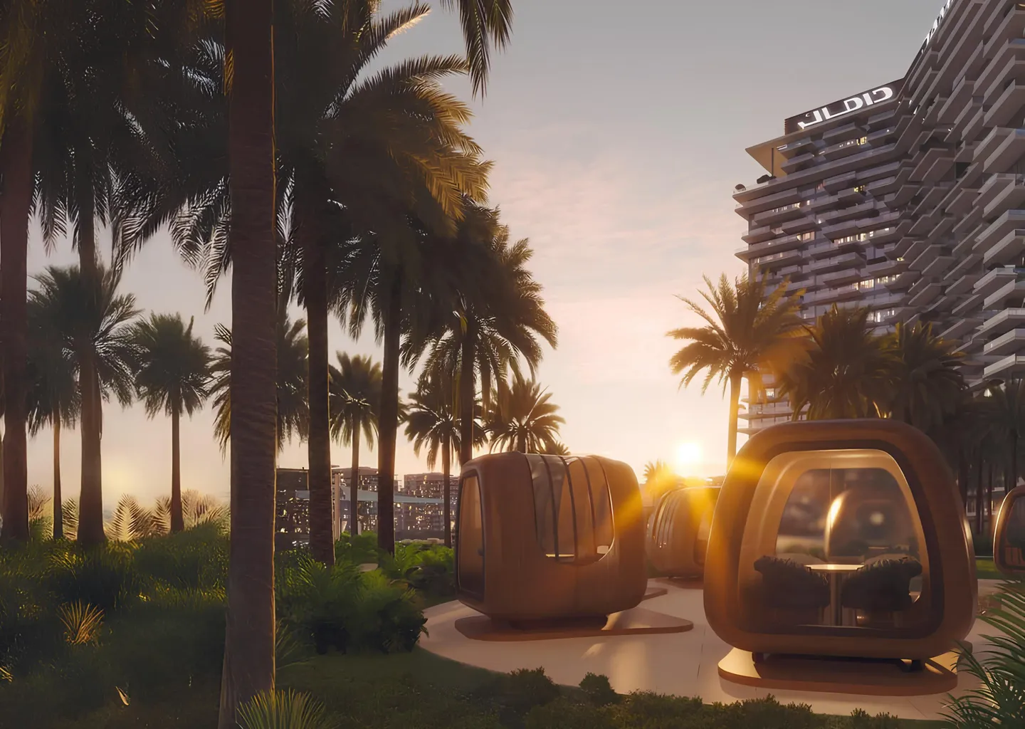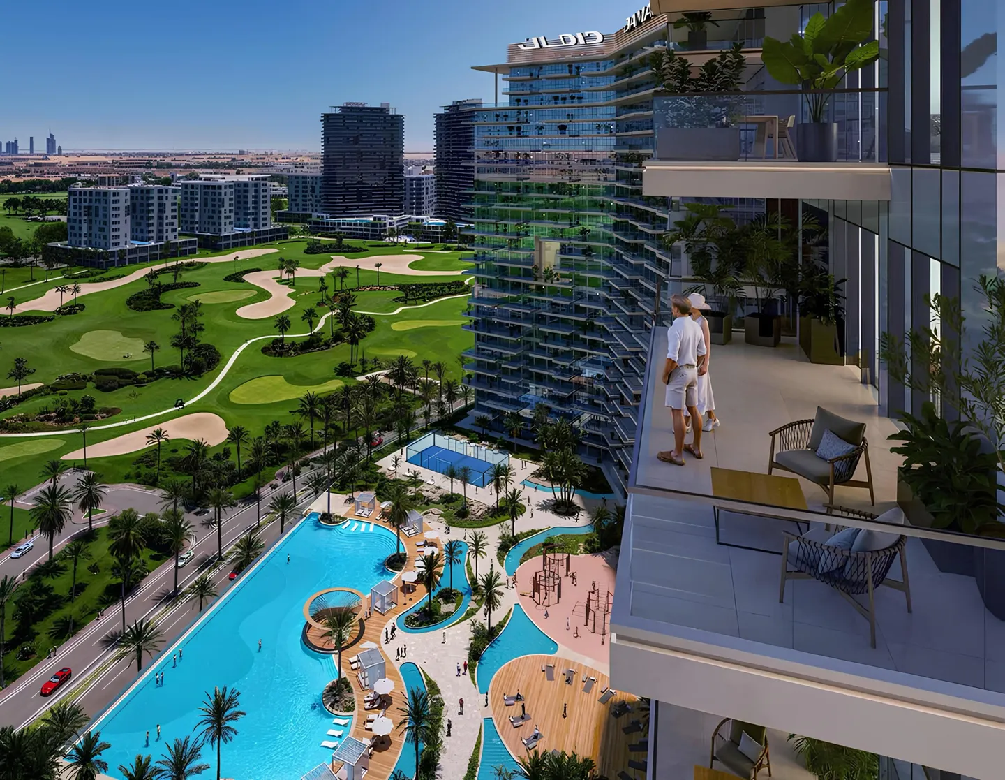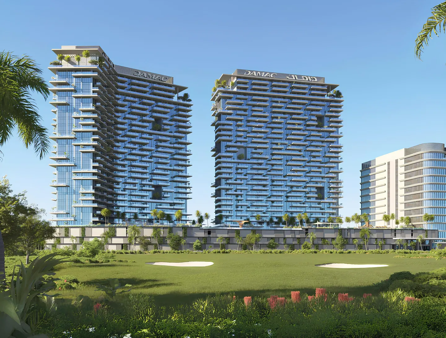 Damac District Tower B is a residential project by the developer DAMAC Properties, located in the Damac Hills community and forming part of a mixed-use development comprising two residential towers and one office tower. The building includes a ground floor, two podium levels, and twenty-nine residential floors. The architecture is designed in a contemporary style, featuring cascading façades, spacious terraces, and integrated greenery that shape the project’s distinctive silhouette.