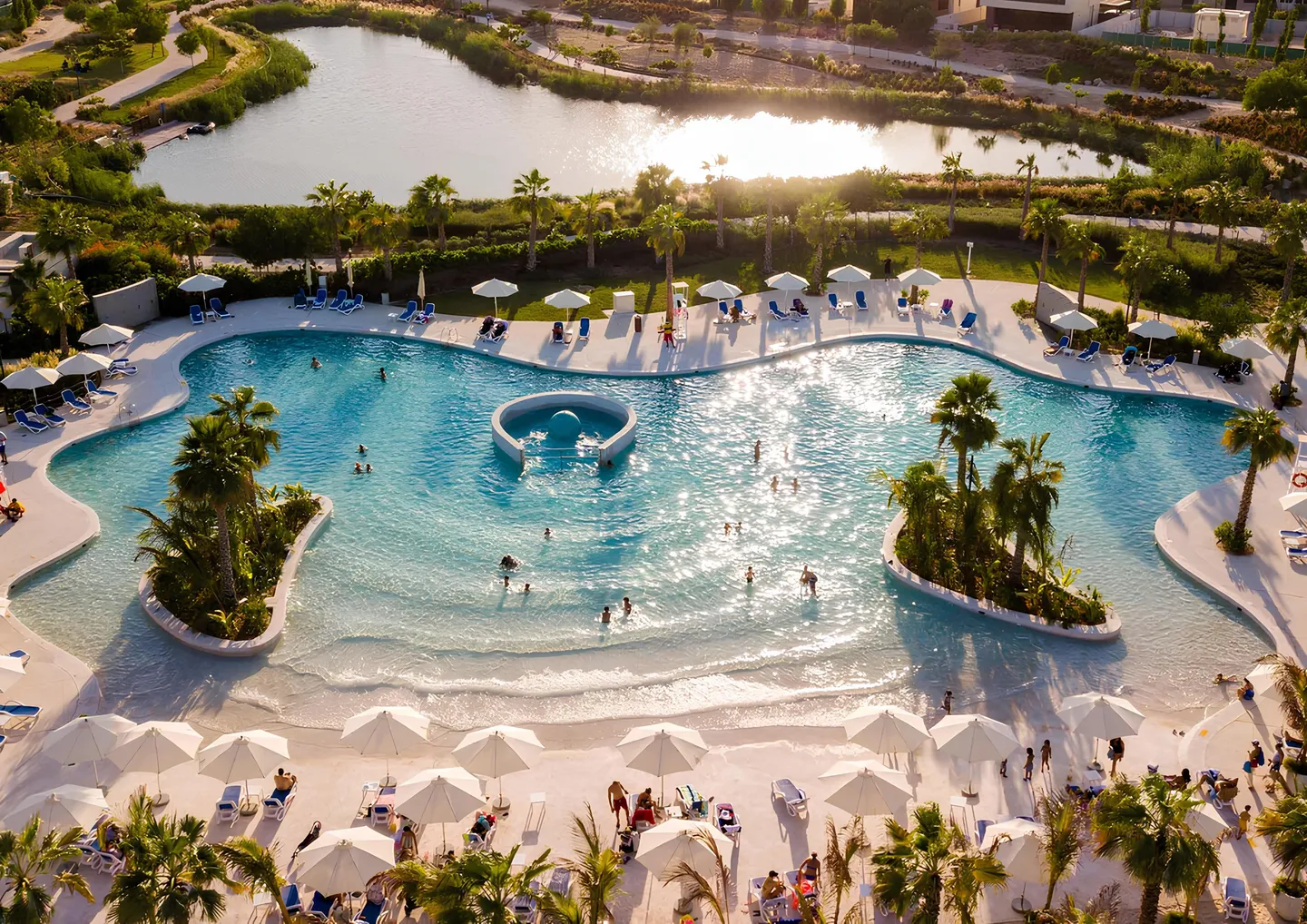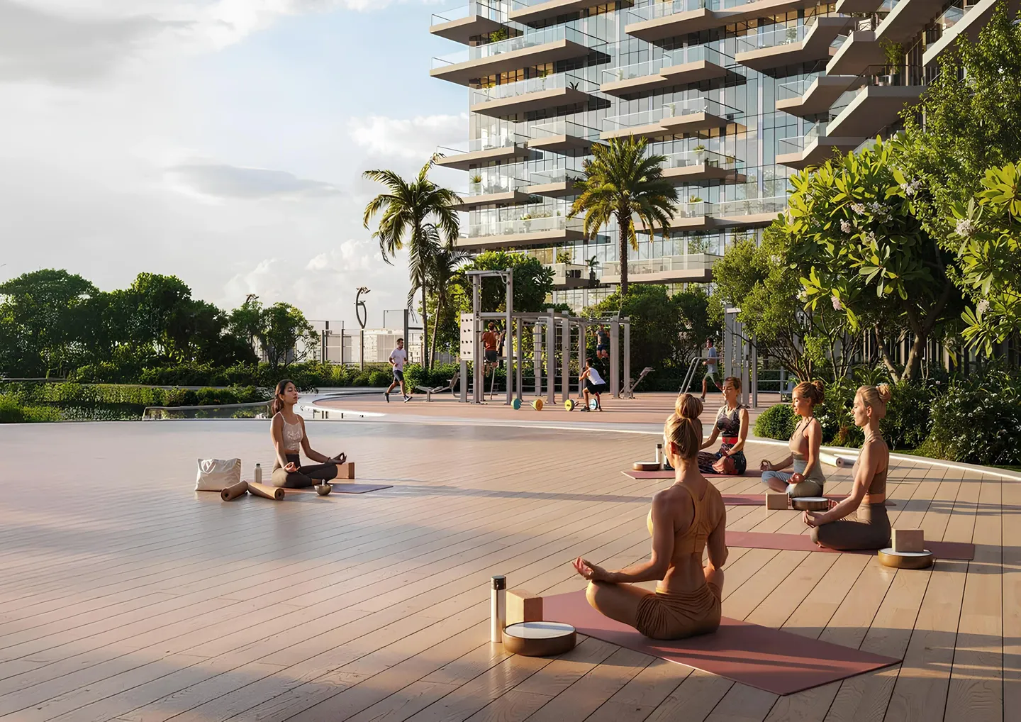 The complex infrastructure brings together spaces for leisure, sports, and wellness. Residents have access to private dining areas, BBQ stations, children’s playgrounds and pools, yoga spaces, and relaxation areas with water features.
