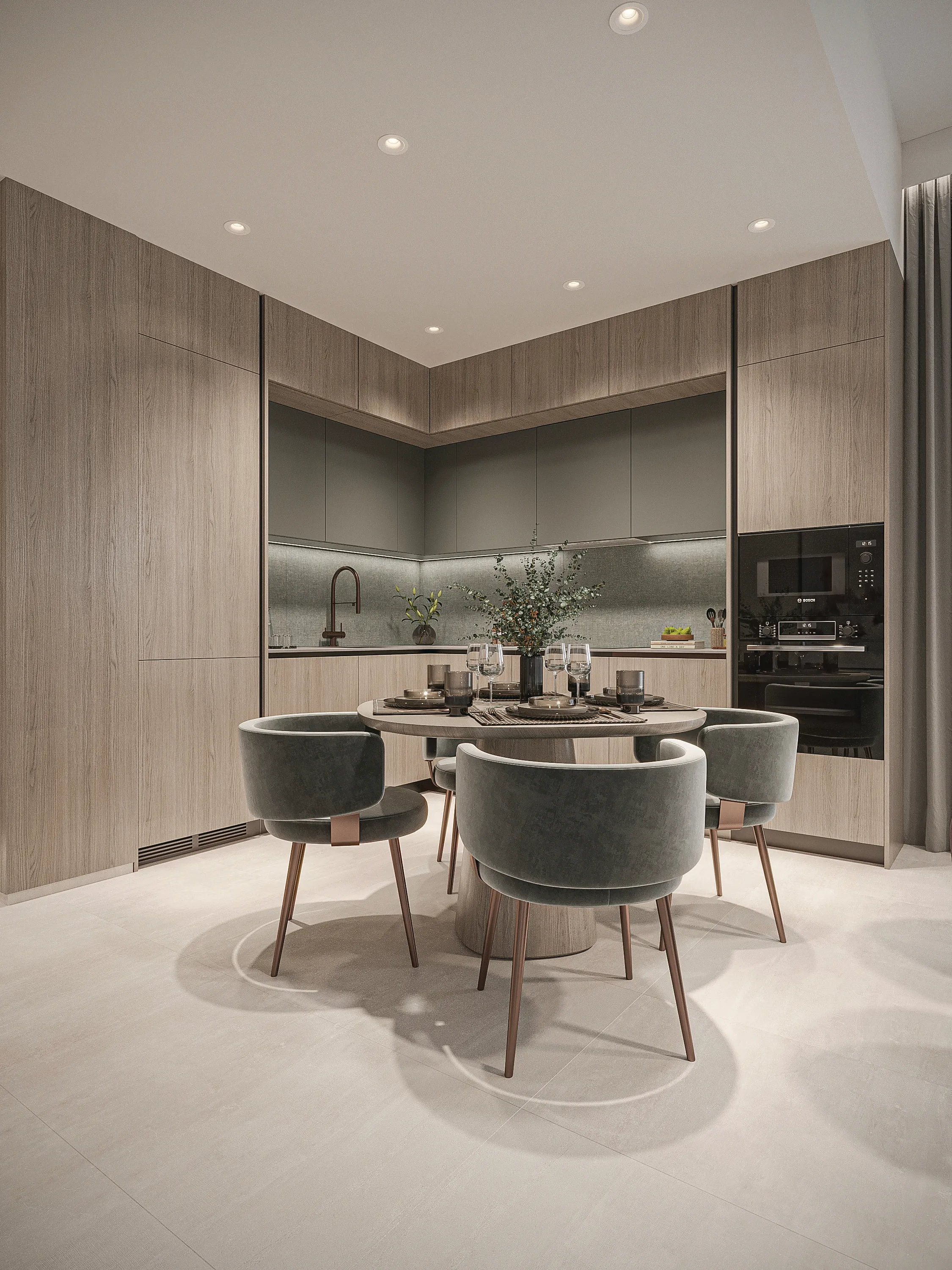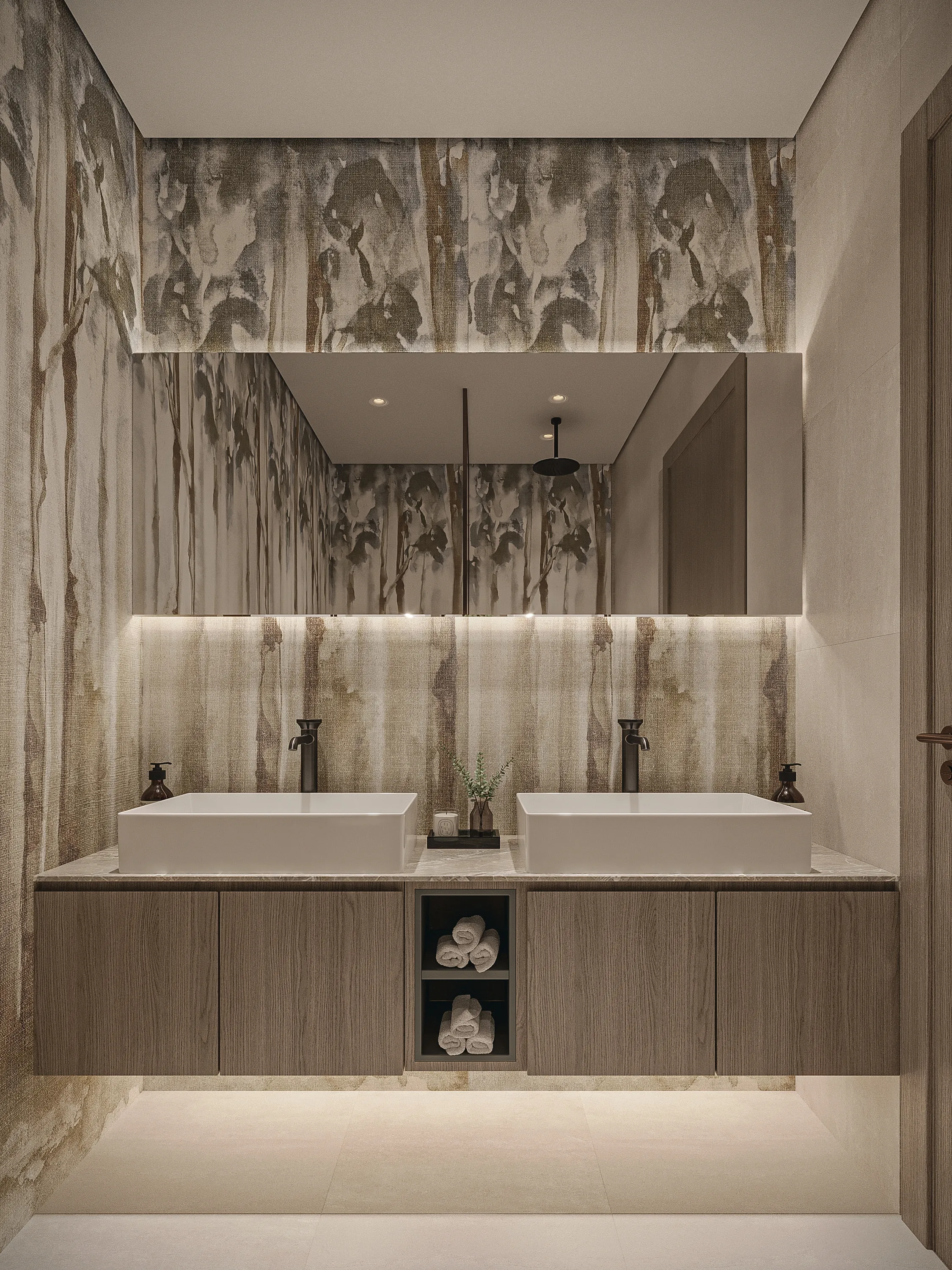 Floarea Breeze features premium European finishes and fittings. Living areas include decorative walls with wood-textured accents, while bedrooms come with built-in MDF wardrobes and dresser consoles. Kitchens are fully fitted with Bosch appliances and quartz countertops, complemented by porcelain backsplashes and high-quality European hardware. Bathrooms are equipped with sanitary ware from GESSI, LAUFEN, and IWW. Each home includes a Smart Home System powered by Alexa, with glass touch panels and digital climate control for effortless comfort.