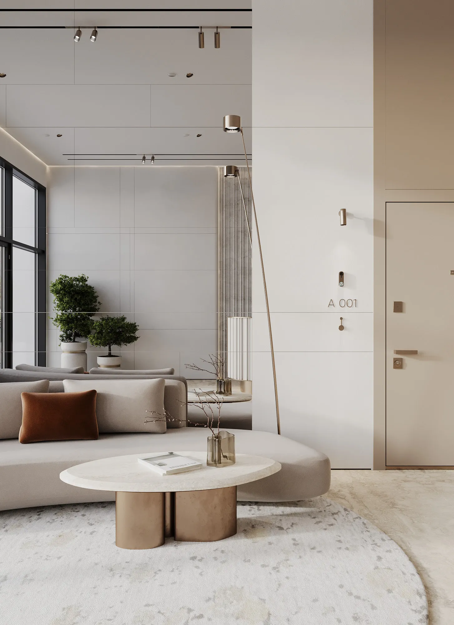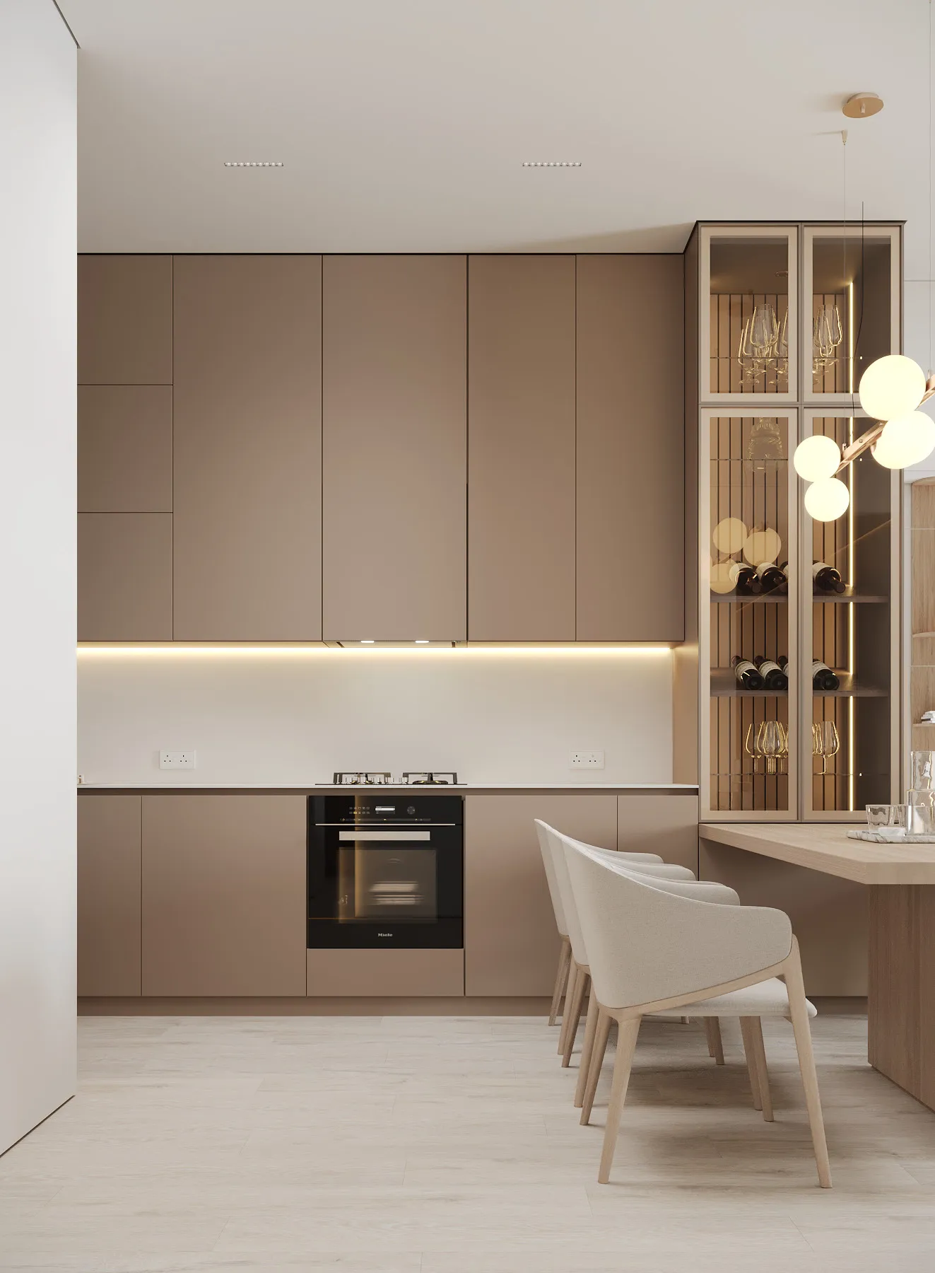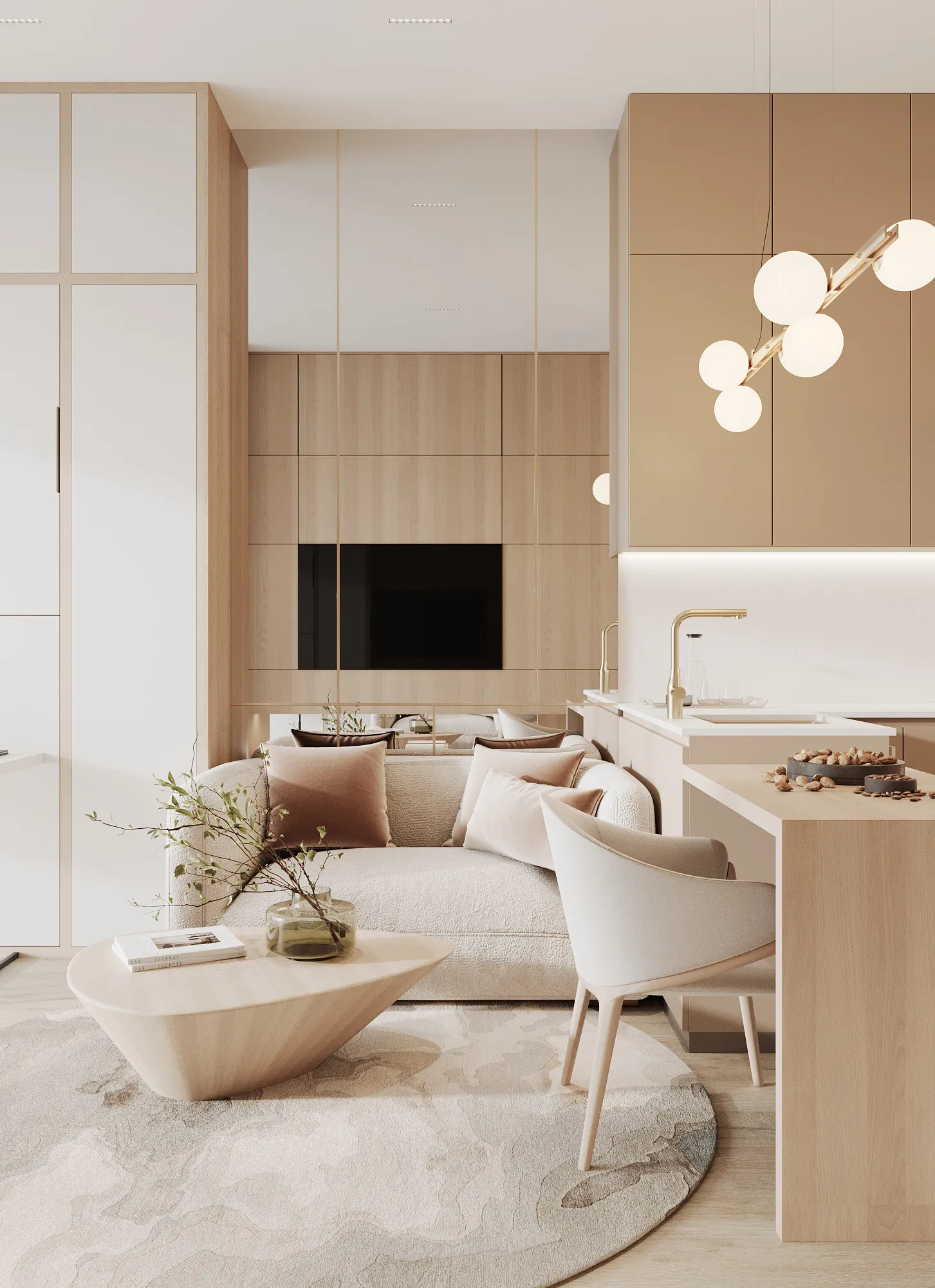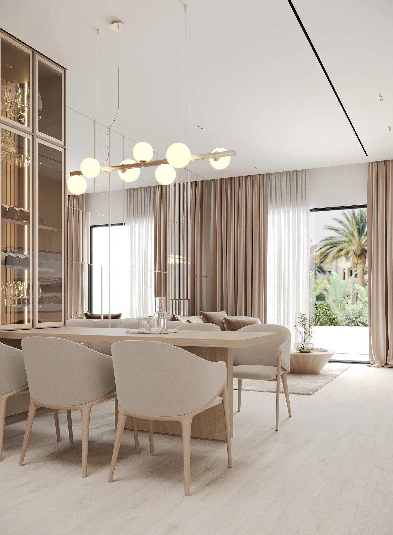 Interior spaces are defined by minimalist elegance and a soft, neutral palette that allows natural light to shape the atmosphere. Floor-to-ceiling windows enhance brightness and openness, while premium materials and refined finishes elevate the living experience. Furniture layouts are designed to be both functional and aesthetically balanced, supporting modern lifestyles without compromising comfort. Kitchens are seamlessly integrated into the living areas, featuring contemporary cabinetry and clean-lined surfaces that blend beauty with purpose. Decorative elements are subtle and cohesive, creating serene interiors that serve as a flexible canvas for personal expression.