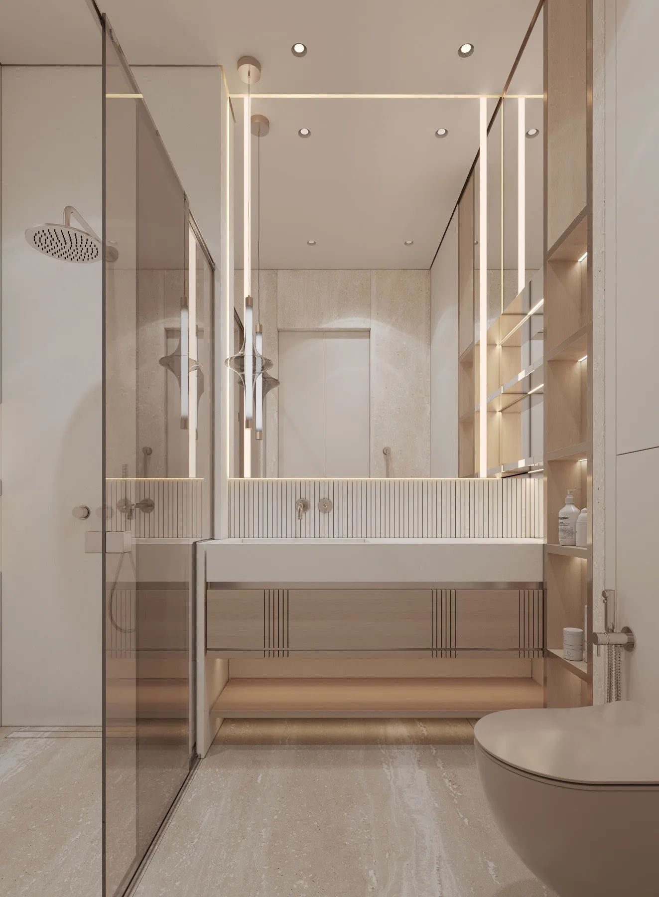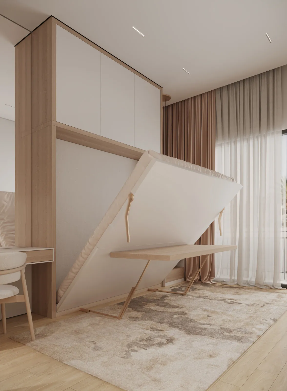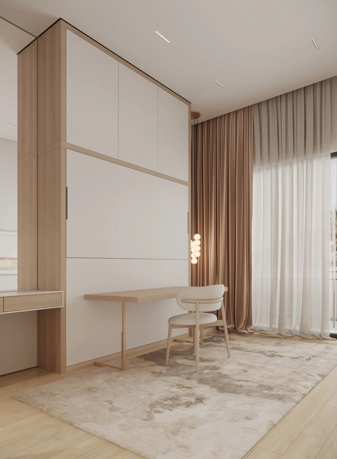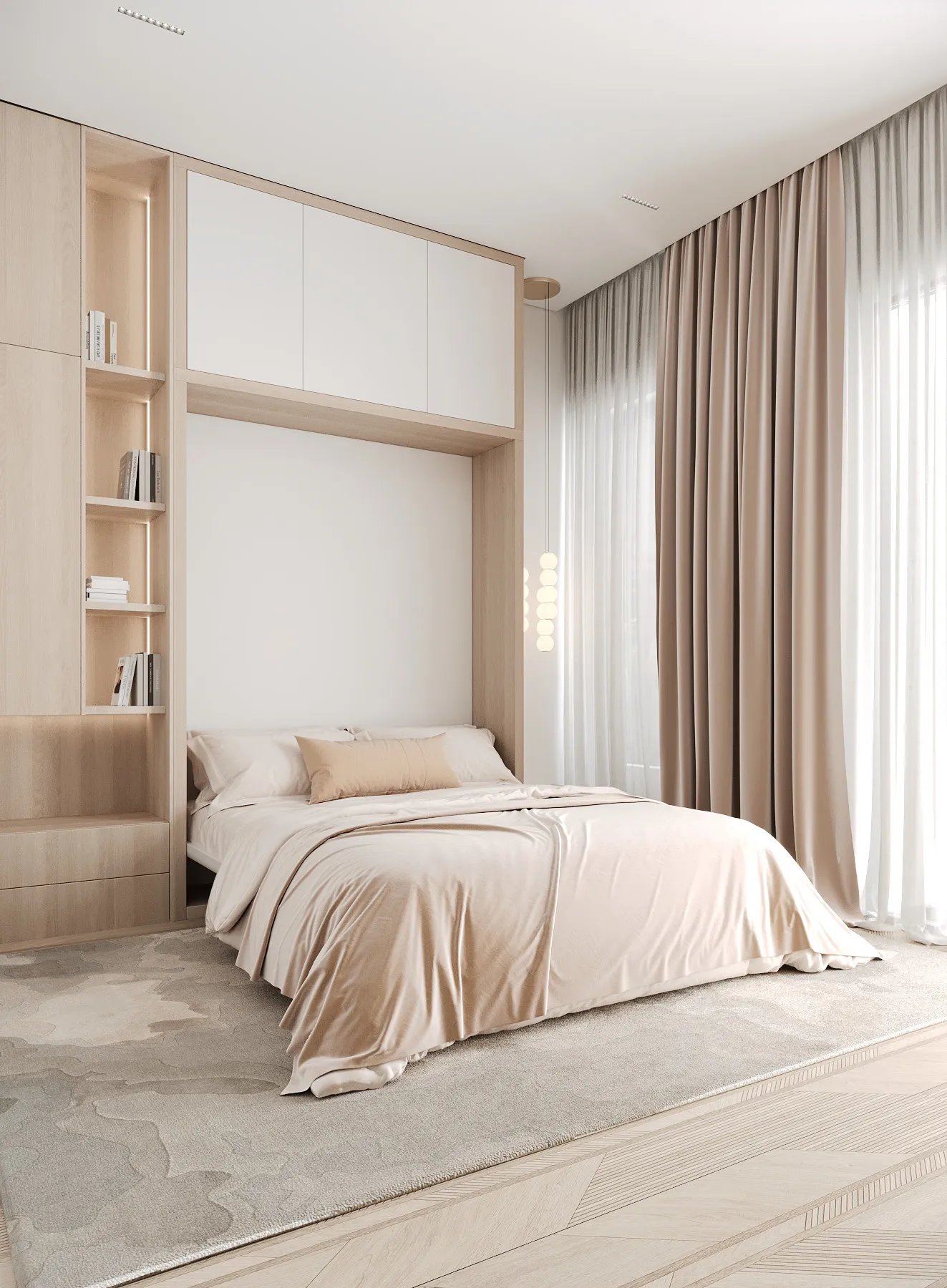 Interior spaces are defined by minimalist elegance and a soft, neutral palette that allows natural light to shape the atmosphere. Floor-to-ceiling windows enhance brightness and openness, while premium materials and refined finishes elevate the living experience. Furniture layouts are designed to be both functional and aesthetically balanced, supporting modern lifestyles without compromising comfort. Kitchens are seamlessly integrated into the living areas, featuring contemporary cabinetry and clean-lined surfaces that blend beauty with purpose. Decorative elements are subtle and cohesive, creating serene interiors that serve as a flexible canvas for personal expression.