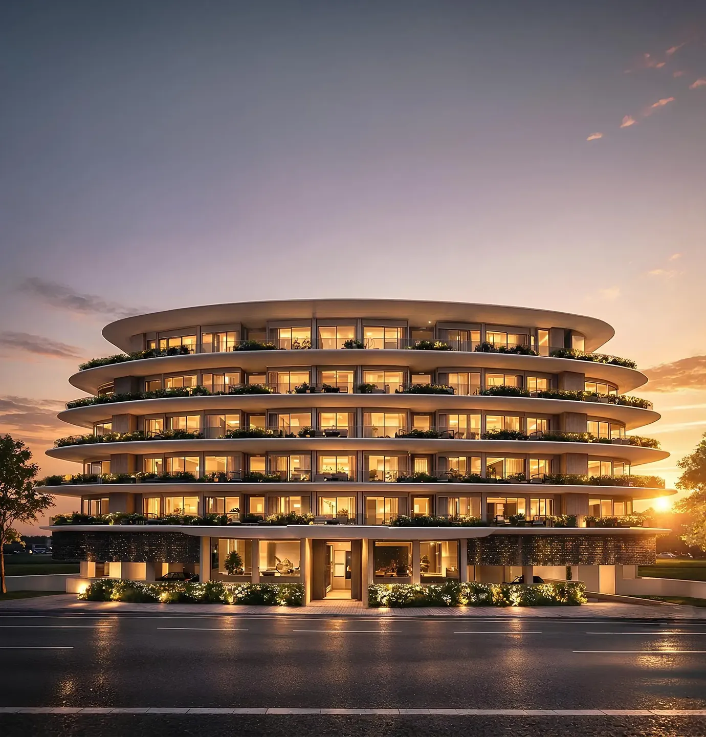 The complex is a building consisting of a ground floor and five residential floors with apartments. The architecture is defined by clean geometric lines, refined proportions, and panoramic glazing that emphasize a contemporary and harmonious exterior.