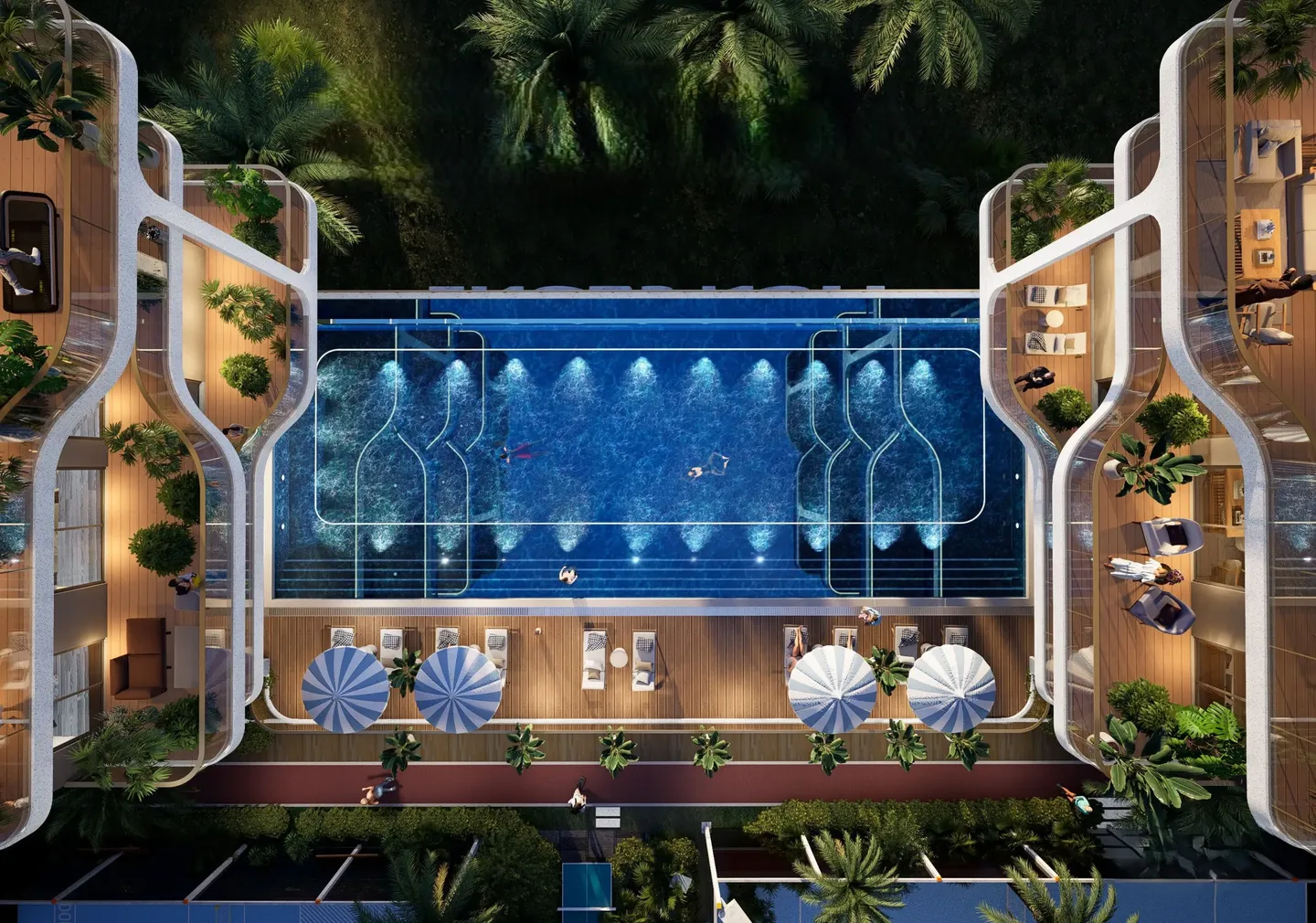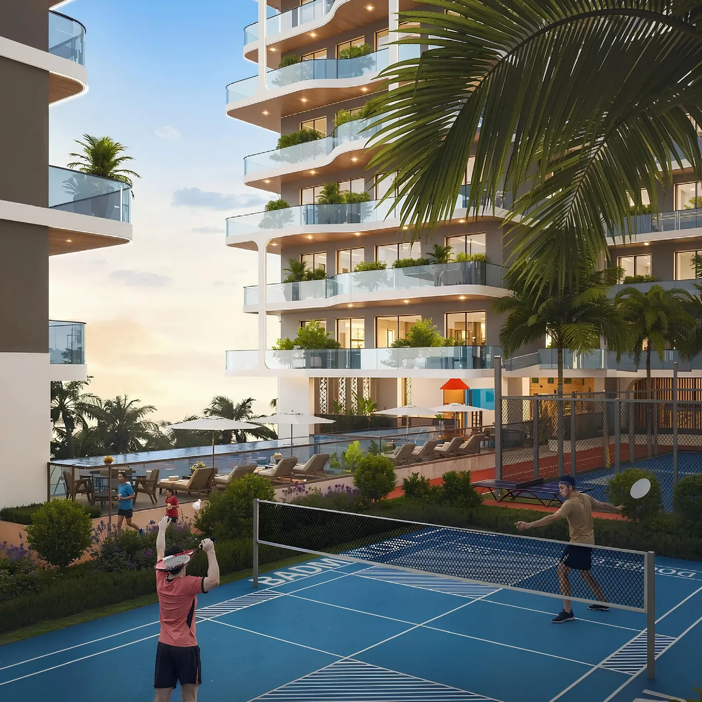 The complex offers a wide range of amenities, including badminton and padel courts, table tennis, a yoga area, a gym, an infinity pool, a children’s pool, a kids' play area, an open-air cinema, and a BBQ area.