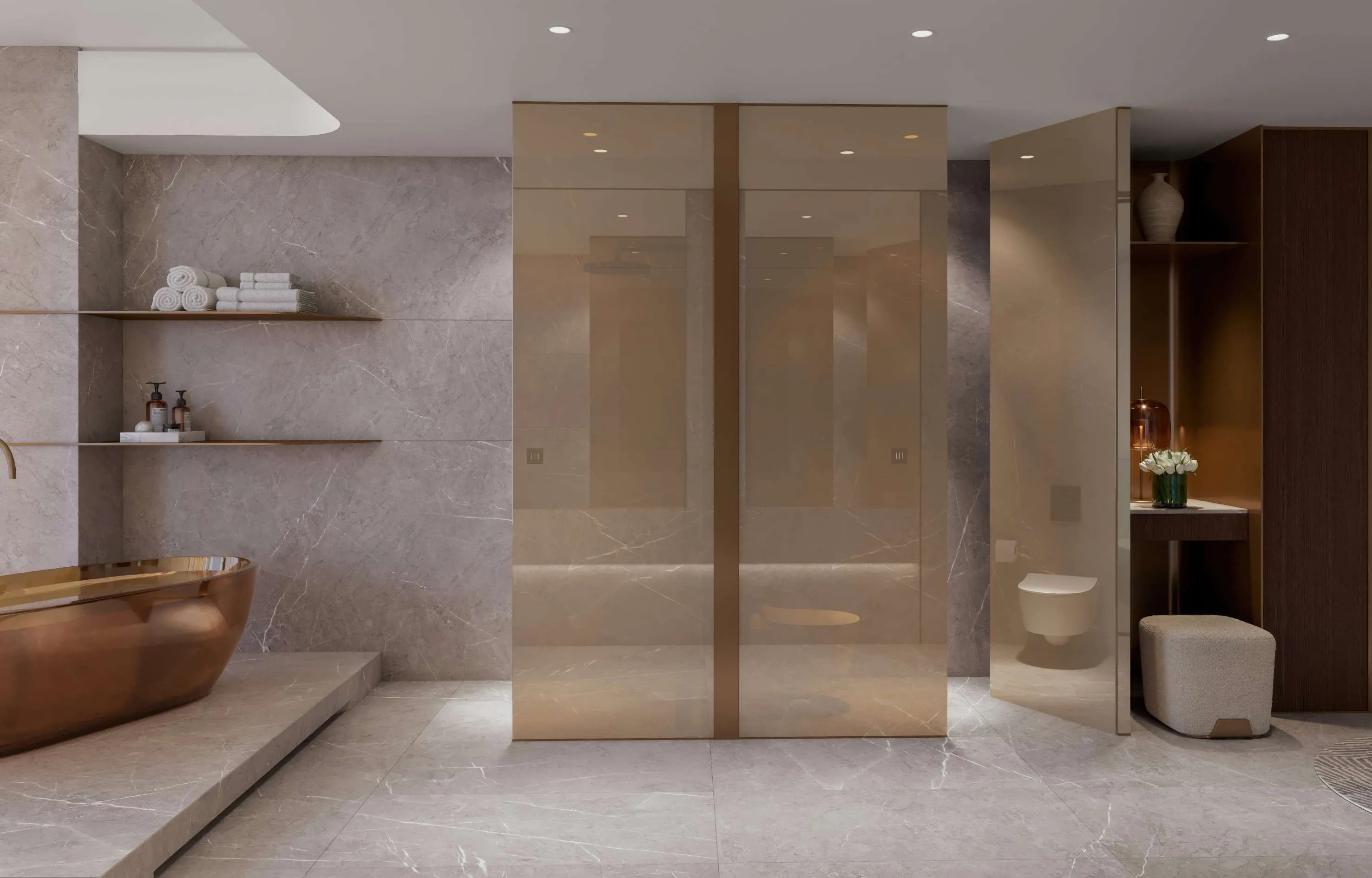Inside, Palazzo Tissoli translates timeless craftsmanship into living form. Fully furnished studios and one-bedroom apartments reflect the balance between elegance and practicality — stone, wood, and glass form a warm, tactile palette, complemented by bespoke lighting and refined details. Floor-to-ceiling glazing dissolves the boundary between interior and exterior, framing the Arabian Gulf and the Wynn Resort as part of everyday life.
