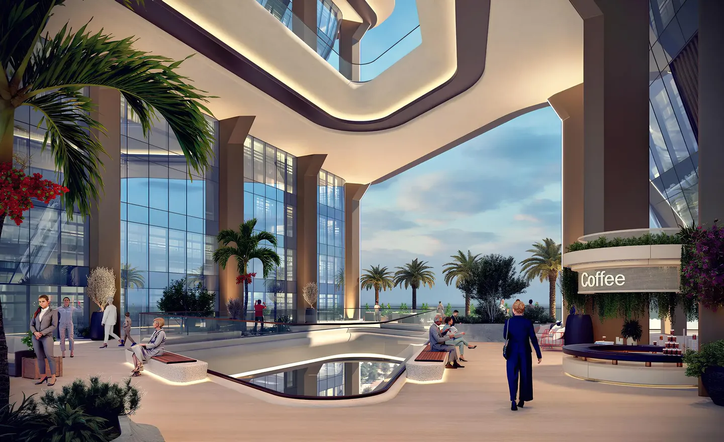 The architecture is designed in a contemporary style with glass façades and clean geometry, creating a distinctive skyline and opening views of the canal and cityscape.