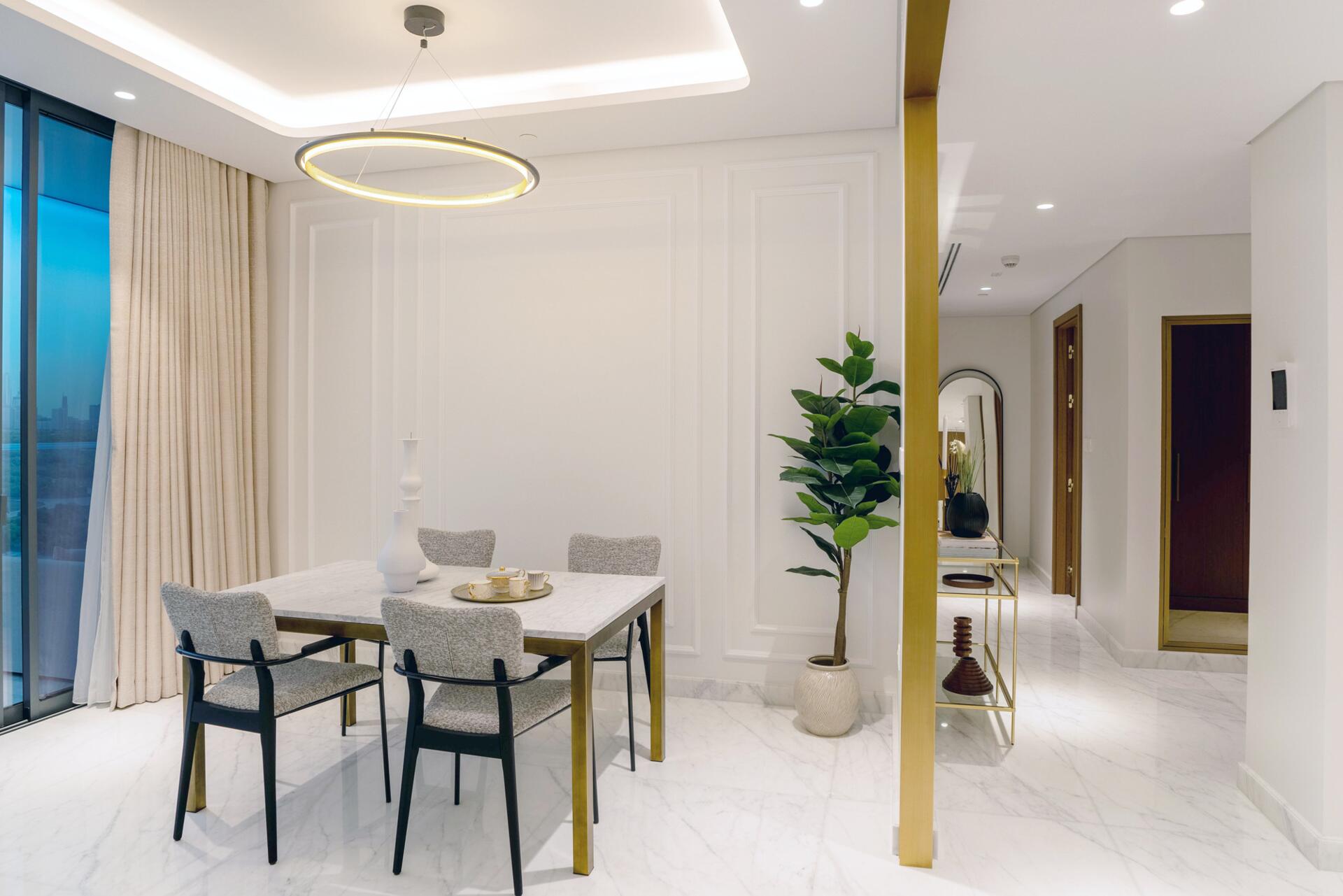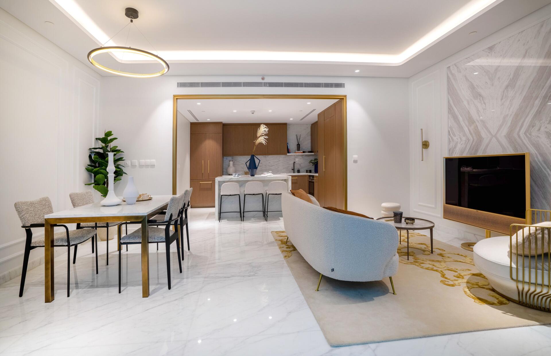 Each apartment is thoughtfully designed with premium wood joinery, bespoke lighting, and Italian marble flooring, creating a sophisticated and intuitive living space. Floor-to-ceiling balcony windows bring in abundant natural light, extending the living area seamlessly outdoors.