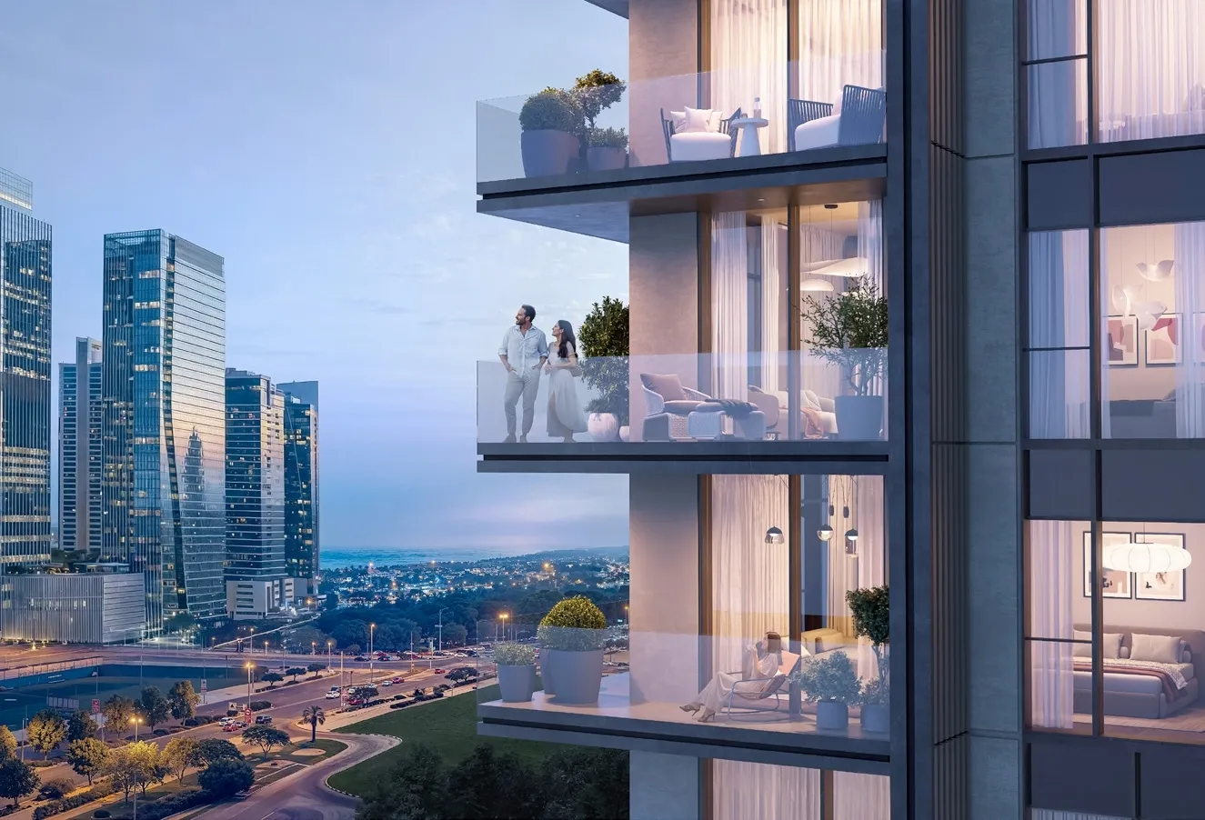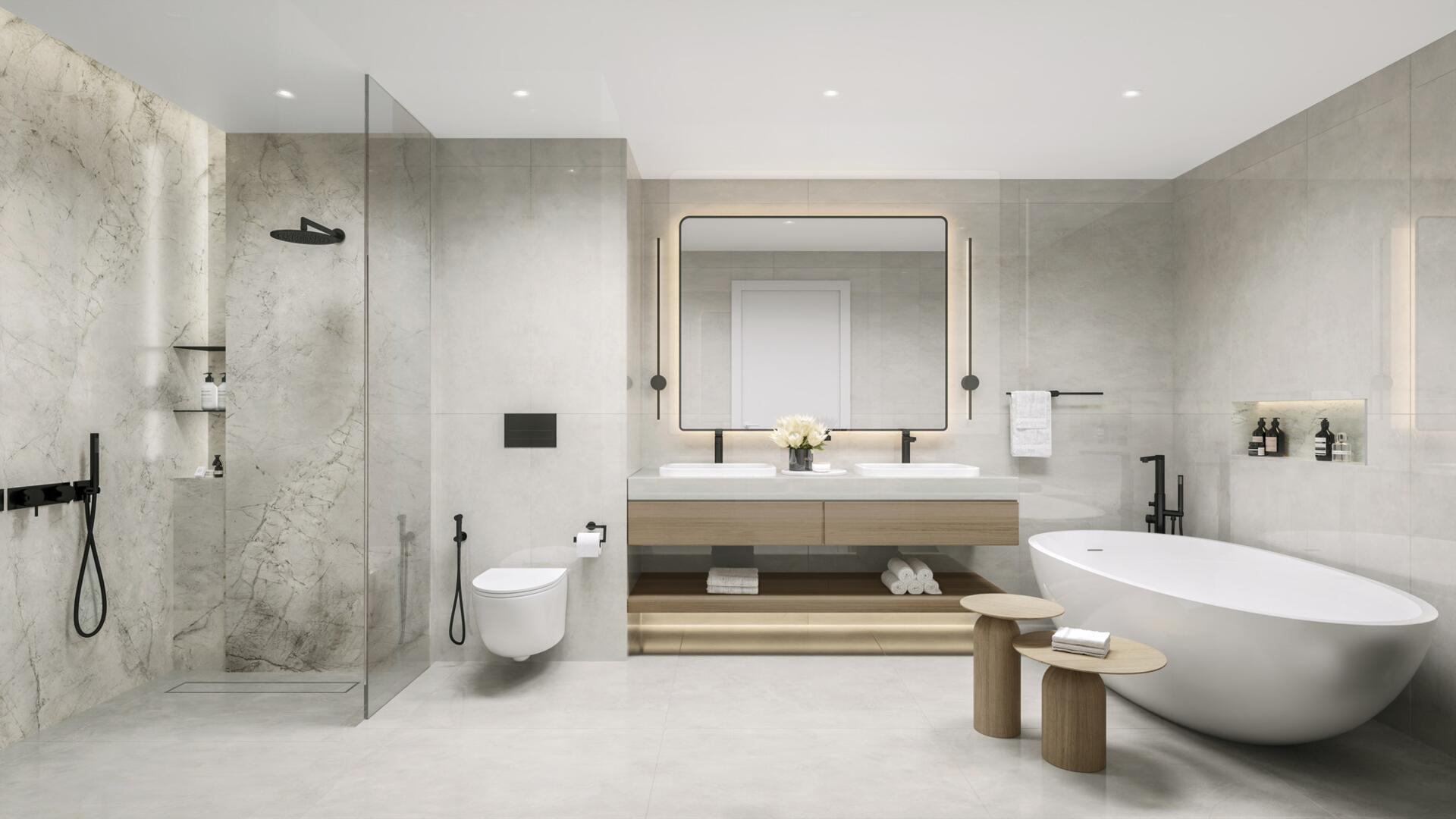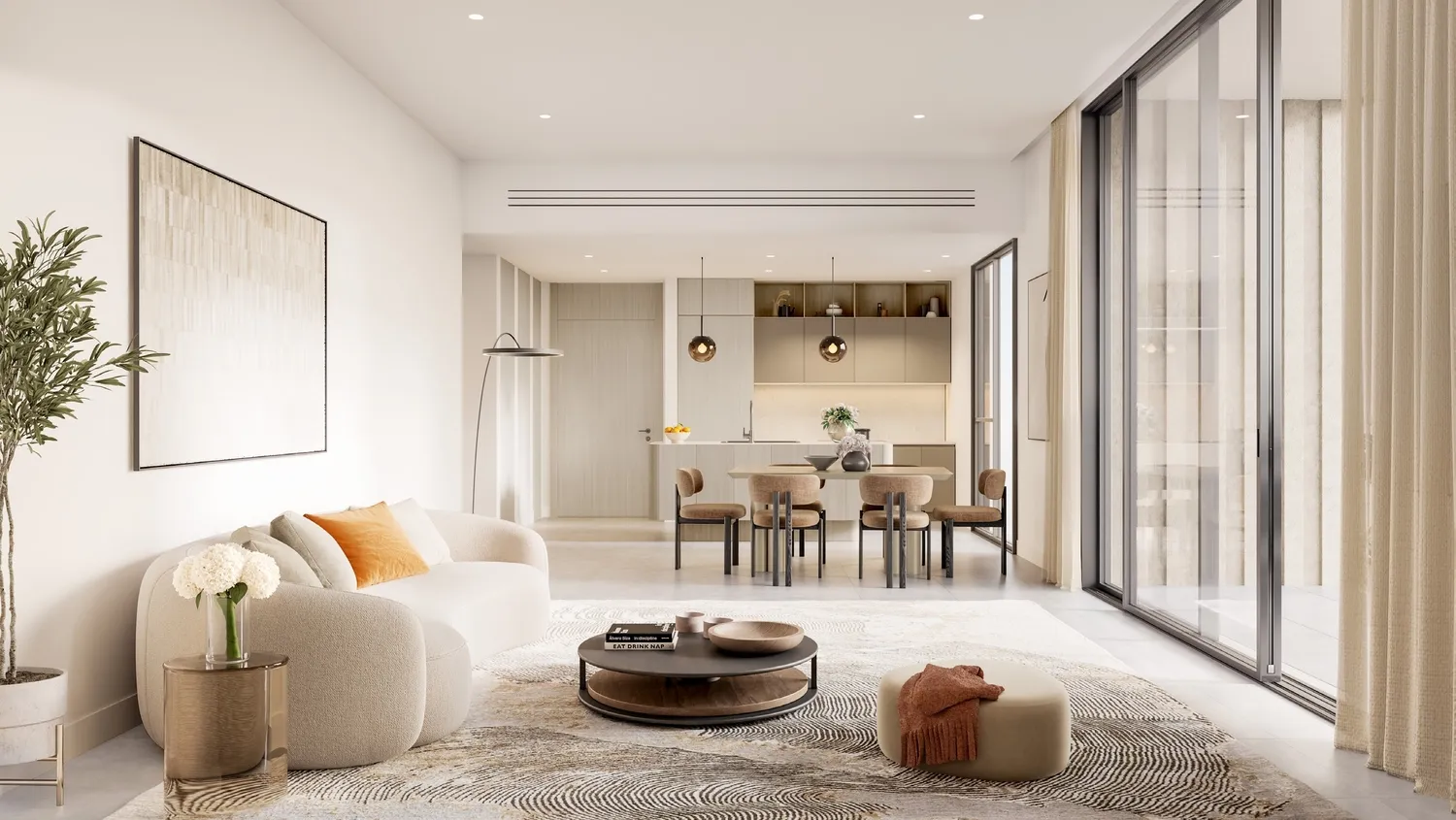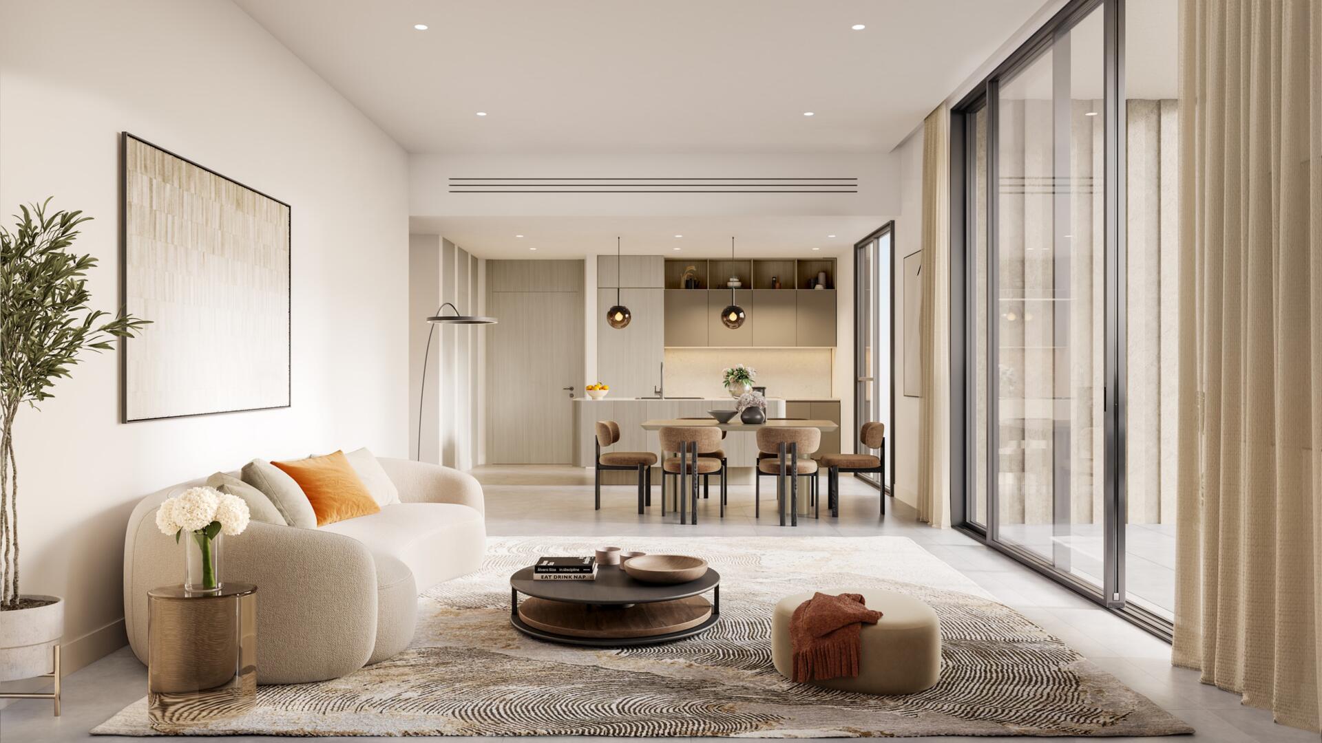 The residences are designed with contemporary interiors that emphasize comfort, practicality, and natural light. Living spaces feature modern finishes and carefully planned layouts that maximize openness and functionality. Kitchens are integrated with sleek cabinetry and dedicated dining areas, creating a seamless connection between cooking and living spaces. Bathrooms are finished in a clean, modern style with refined surfaces, while bedrooms include well-organized layouts with walk-in closets in selected units. Throughout the apartments, the interior palette combines contemporary materials with warm tones to create a calm and welcoming residential atmosphere.