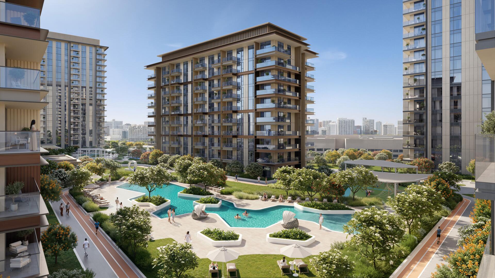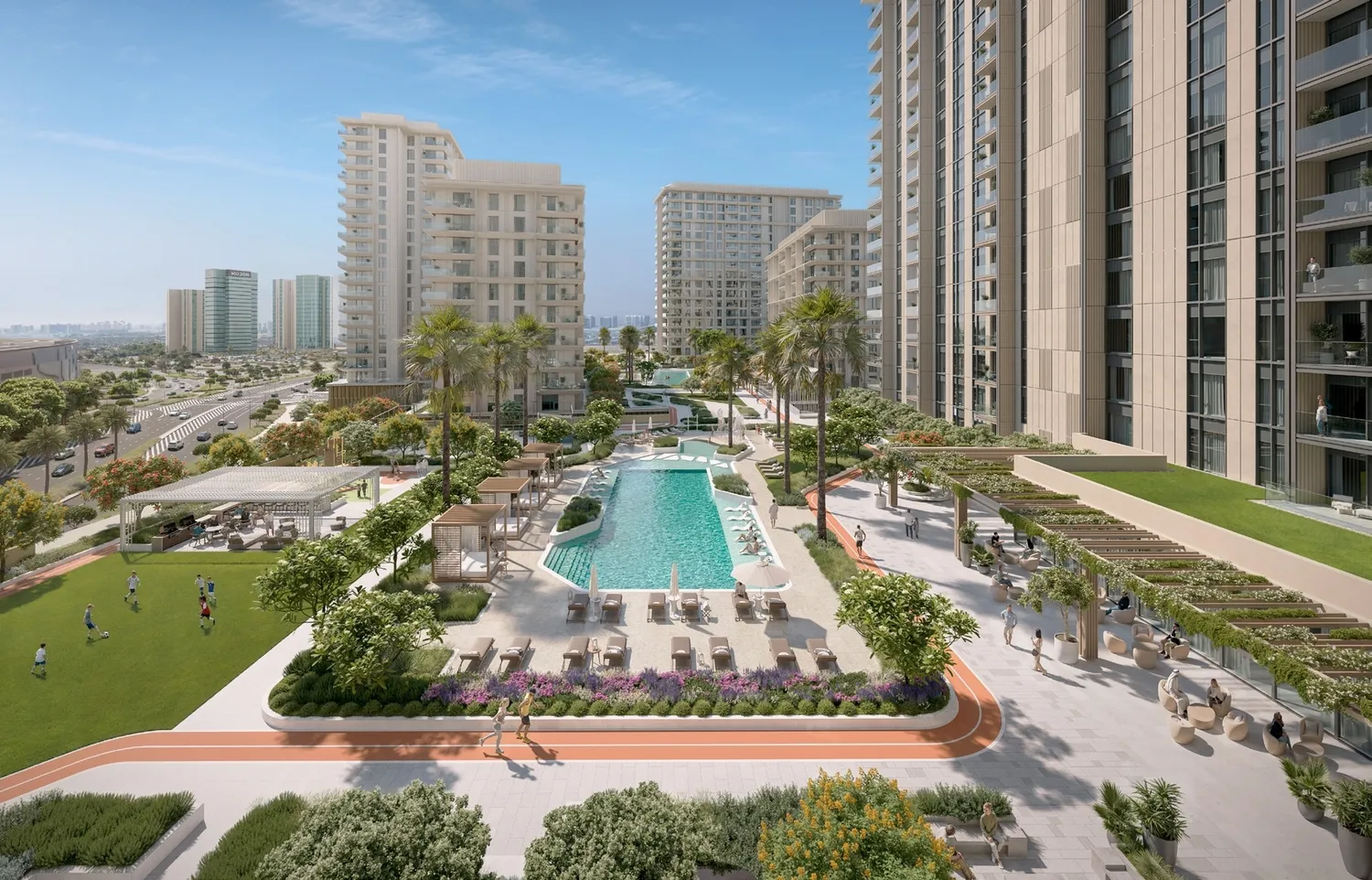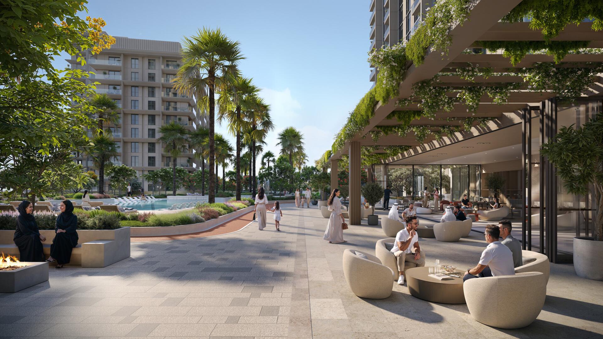 Residents benefit from a wide range of lifestyle-oriented facilities designed to support both activity and relaxation. The community includes a central swimming pool and a dedicated kids’ pool, alongside a fully equipped fitness studio for daily wellness. Outdoor amenities feature landscaped gardens, shaded walkways, open lawns, and a jogging track, creating inviting environments for recreation and social gatherings. Additional facilities include a padel court, multi-purpose sports court, adventure playground, BBQ areas, co-working and study zones, indoor kids’ play spaces, and residents’ lounges. A retail plaza, nursery, and a connecting bridge to Reem Mall further enhance convenience and integrate the development with the surrounding urban fabric.