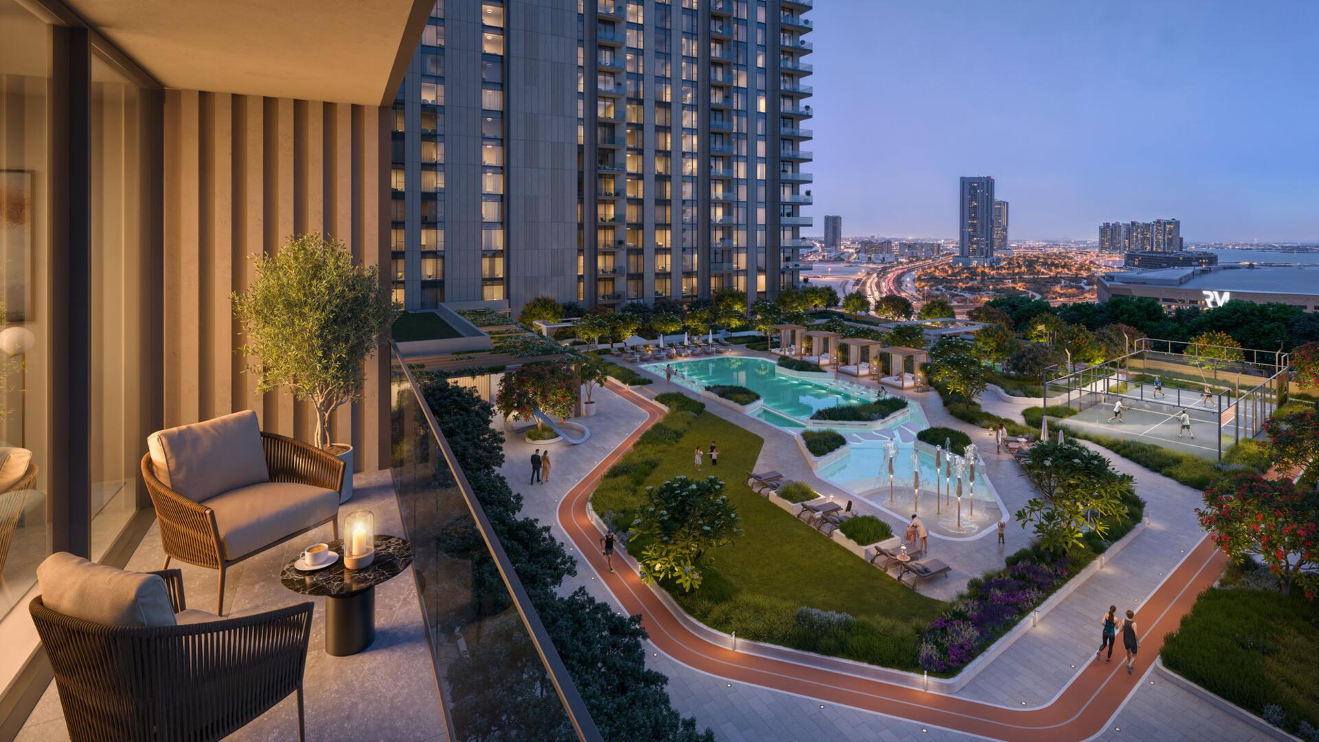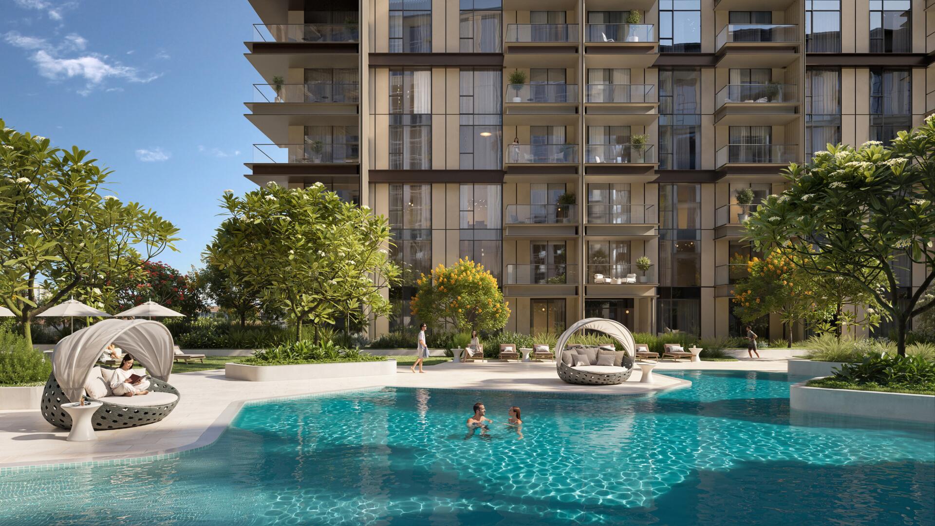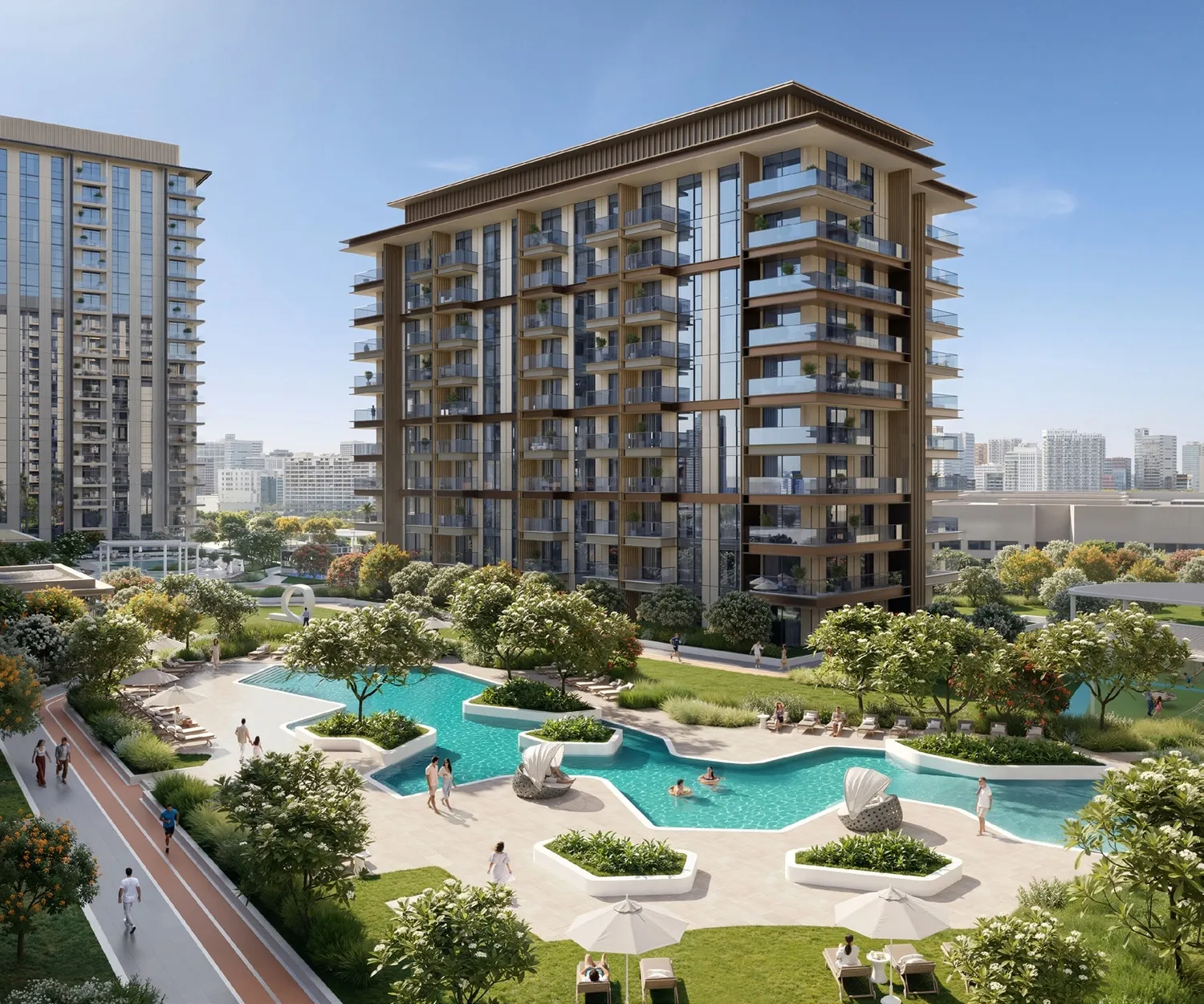 Residents benefit from a wide range of lifestyle-oriented facilities designed to support both activity and relaxation. The community includes a central swimming pool and a dedicated kids’ pool, alongside a fully equipped fitness studio for daily wellness. Outdoor amenities feature landscaped gardens, shaded walkways, open lawns, and a jogging track, creating inviting environments for recreation and social gatherings. Additional facilities include a padel court, multi-purpose sports court, adventure playground, BBQ areas, co-working and study zones, indoor kids’ play spaces, and residents’ lounges. A retail plaza, nursery, and a connecting bridge to Reem Mall further enhance convenience and integrate the development with the surrounding urban fabric.