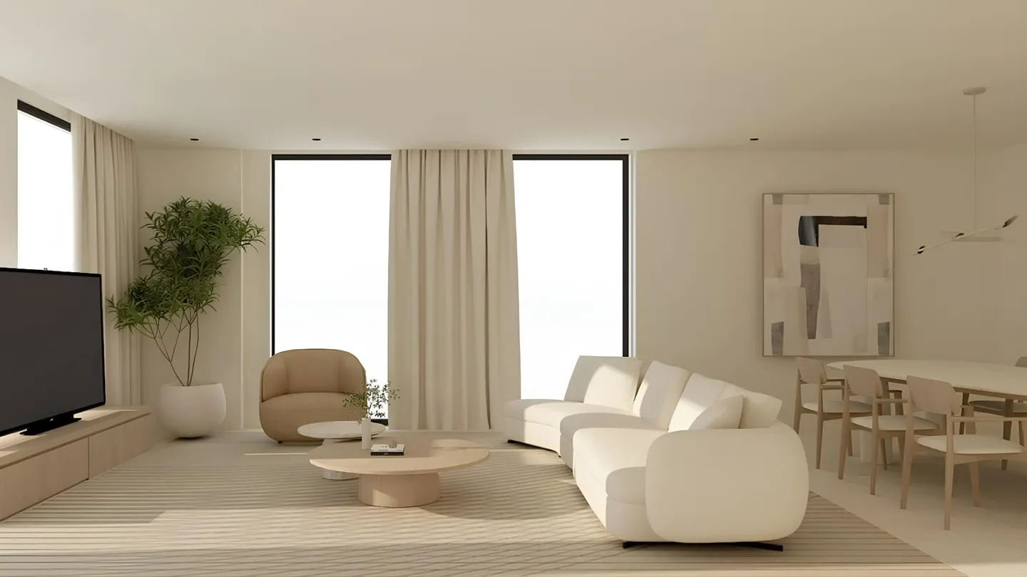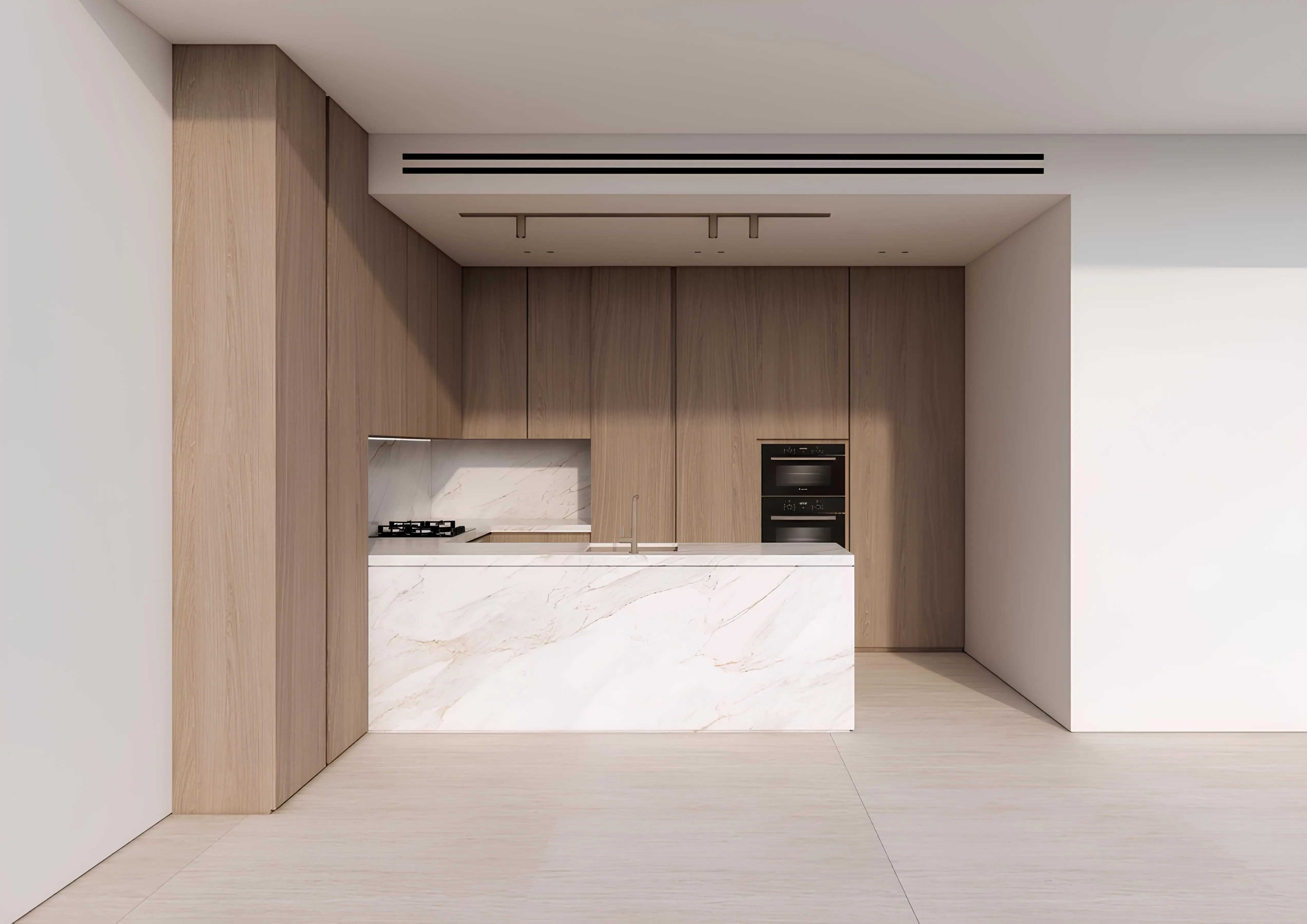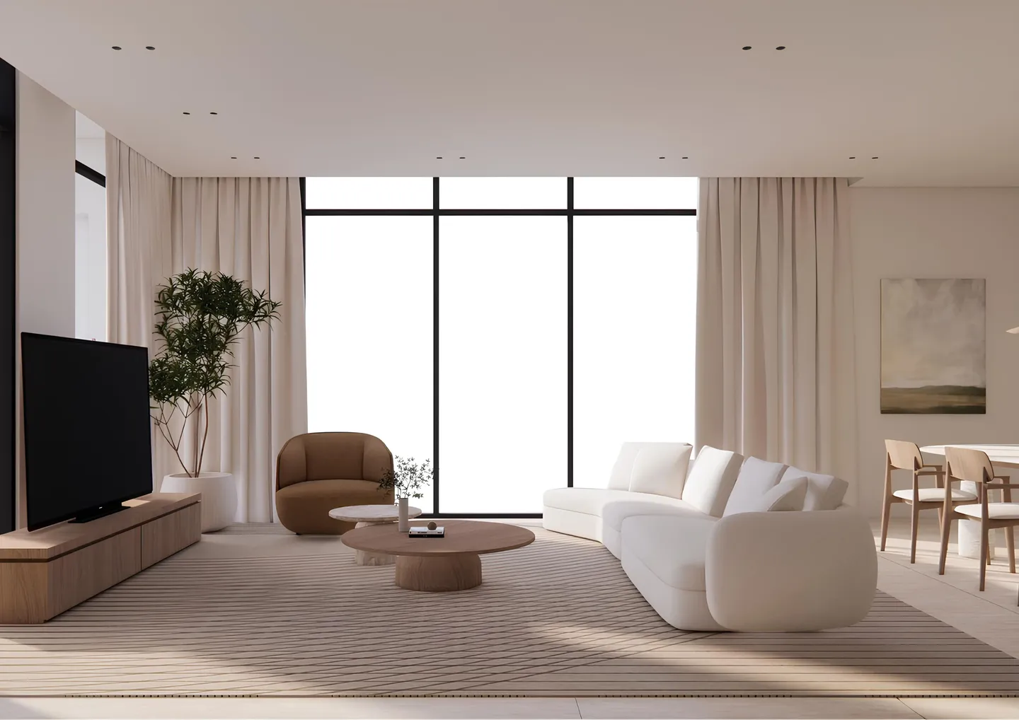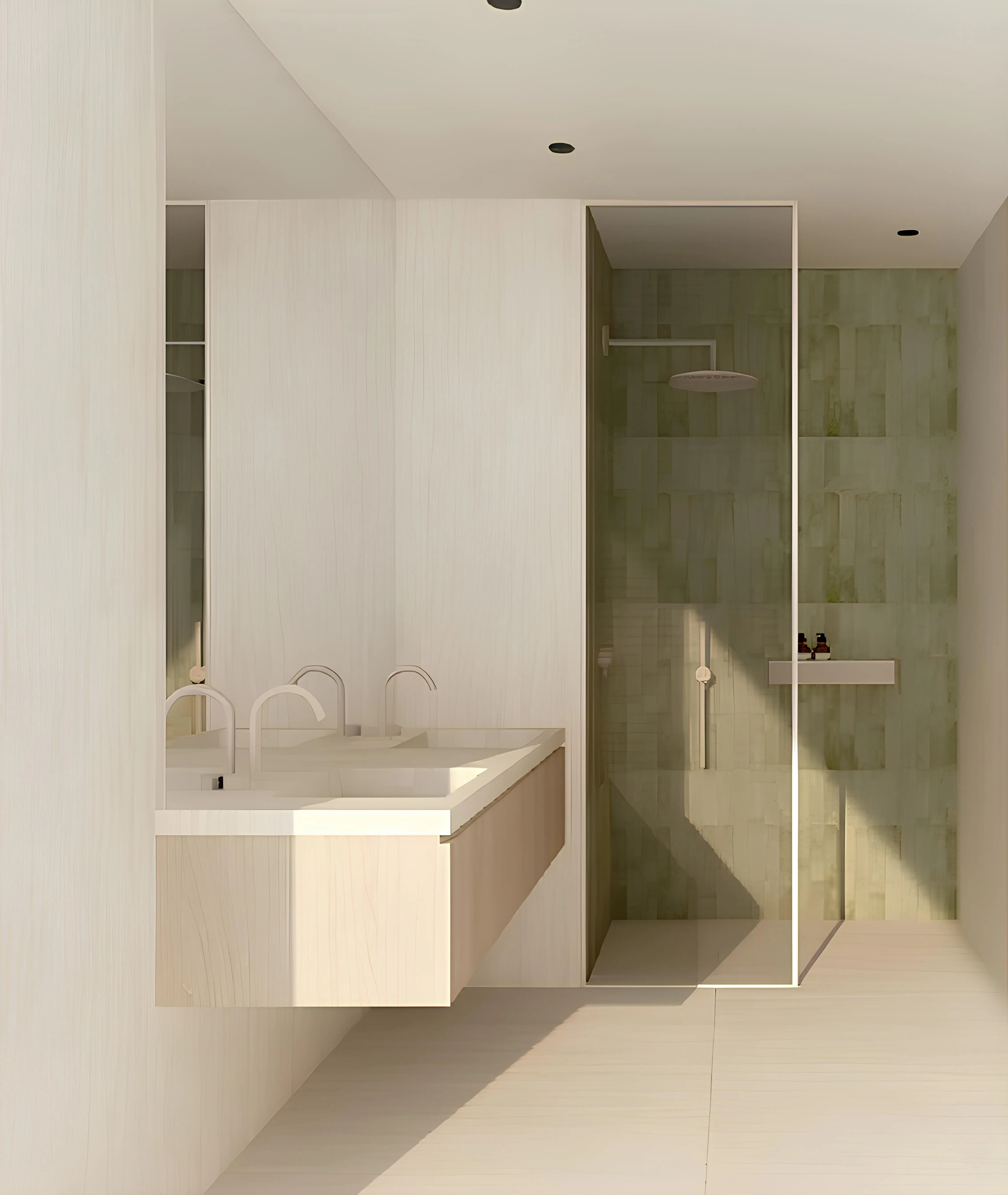 Inside, each residence exudes elegance and sophistication, characterized by premium finishes and meticulous attention to detail. Open-plan living and dining areas create fluid, light-filled spaces perfect for both relaxed everyday living and entertaining guests. Modern kitchens blend seamlessly with the living areas, featuring integrated storage and high-quality fittings. The bedrooms serve as calm private sanctuaries, adorned with soft tones and refined textures. The minimalist aesthetic extends to the bathrooms, where high-quality materials and clean lines transform daily routines into moments of tranquility.