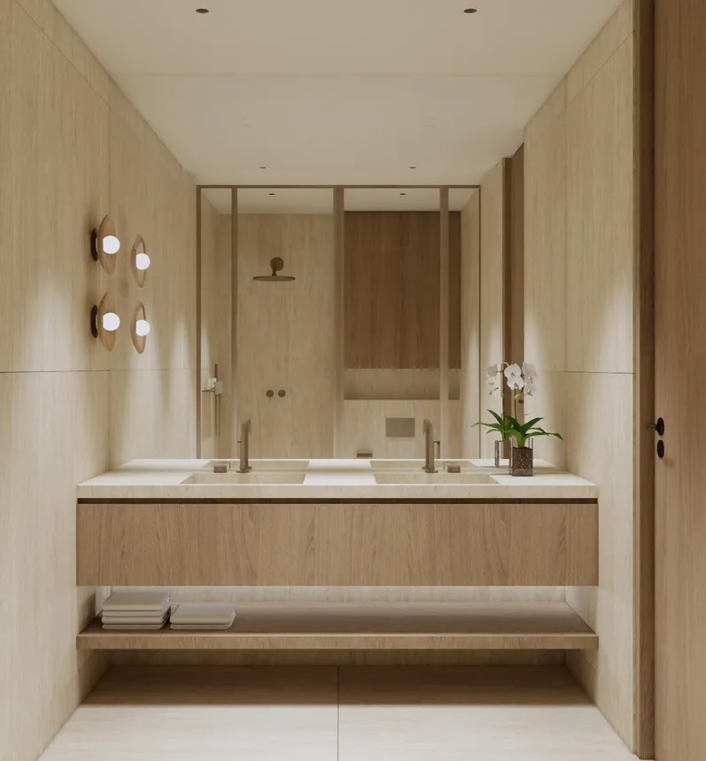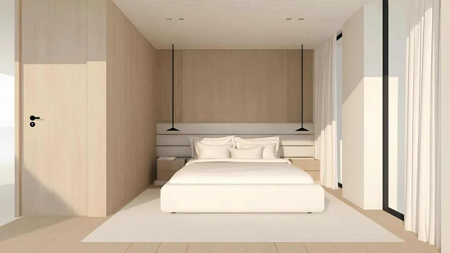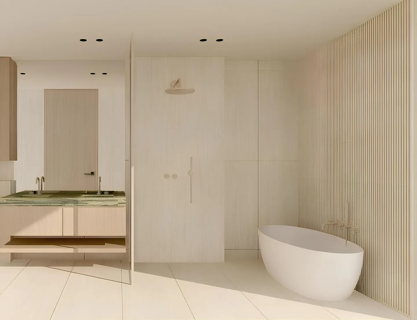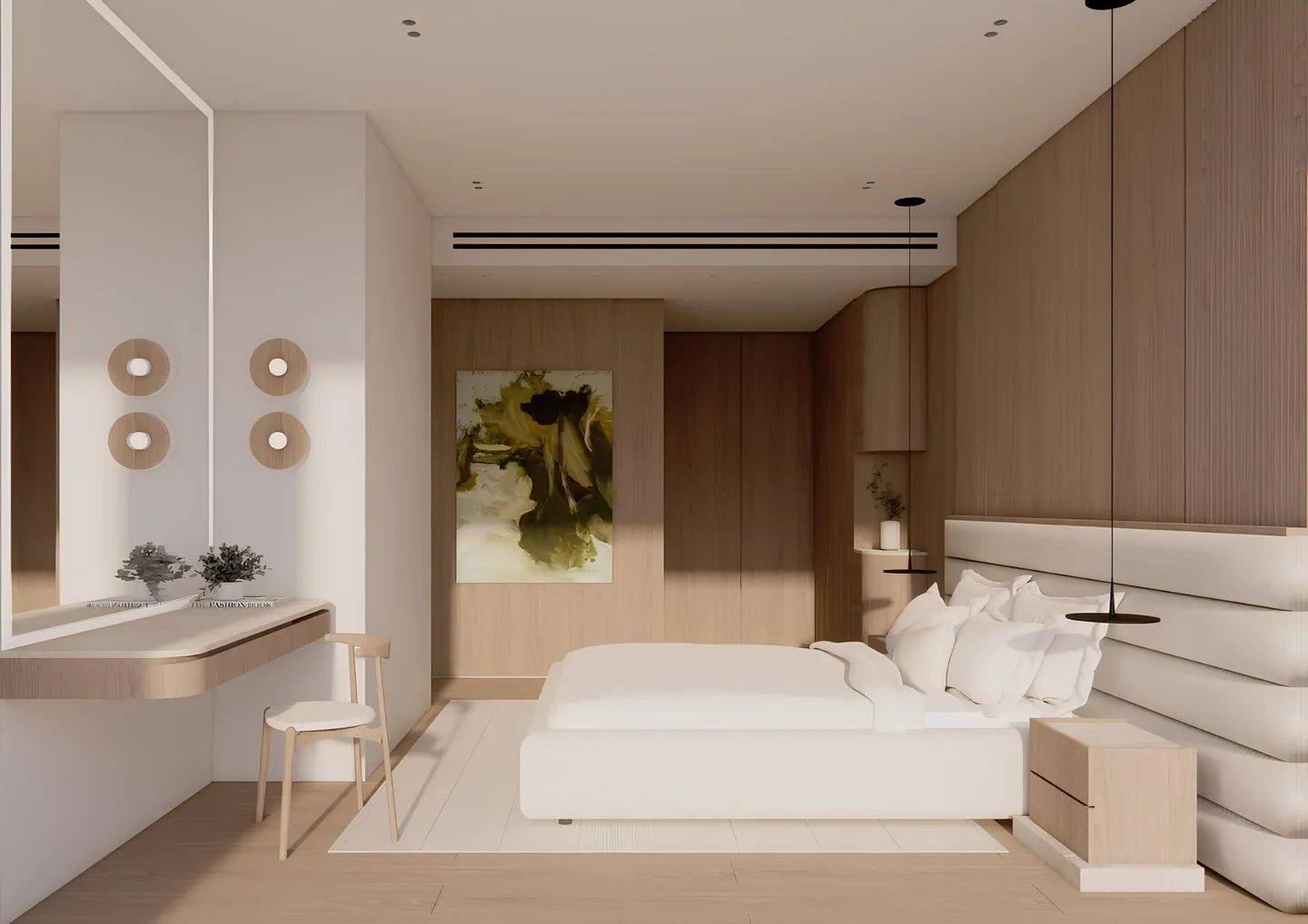 Inside, each residence exudes elegance and sophistication, characterized by premium finishes and meticulous attention to detail. Open-plan living and dining areas create fluid, light-filled spaces perfect for both relaxed everyday living and entertaining guests. Modern kitchens blend seamlessly with the living areas, featuring integrated storage and high-quality fittings. The bedrooms serve as calm private sanctuaries, adorned with soft tones and refined textures. The minimalist aesthetic extends to the bathrooms, where high-quality materials and clean lines transform daily routines into moments of tranquility.